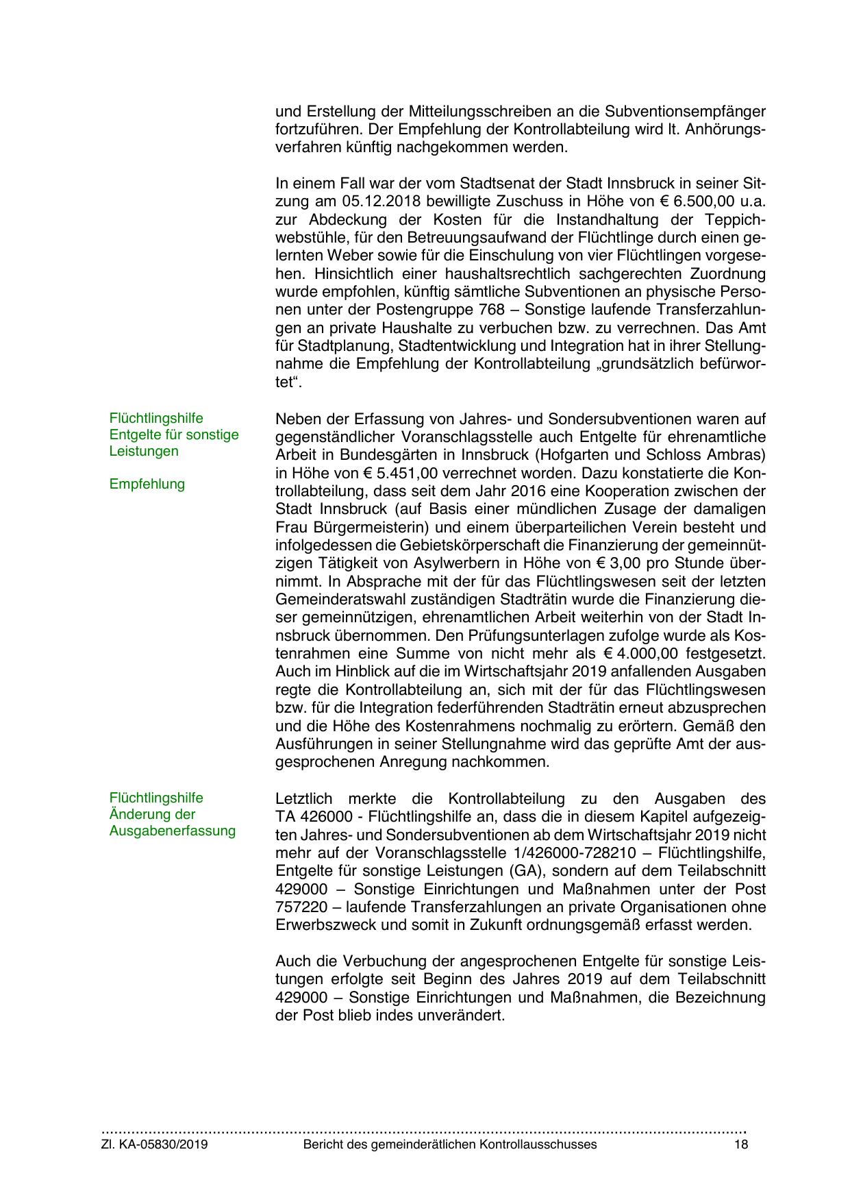 In einem Fall war der vom Stadtsenat der Stadt Innsbruck in seiner Sitzung am 05.12.2018 bewilligte Zuschuss in Höhe von € 6.500,00 u.a.