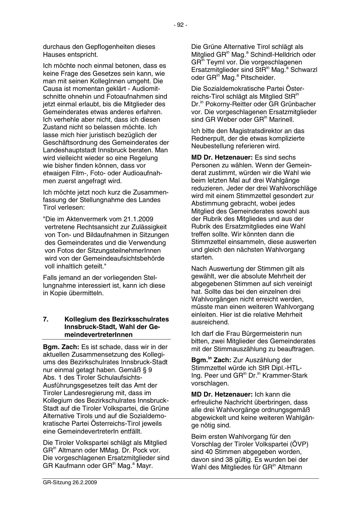 Personen zu wählen. Wenn der Gemeinderat zustimmt, würden wir die Wahl wie
