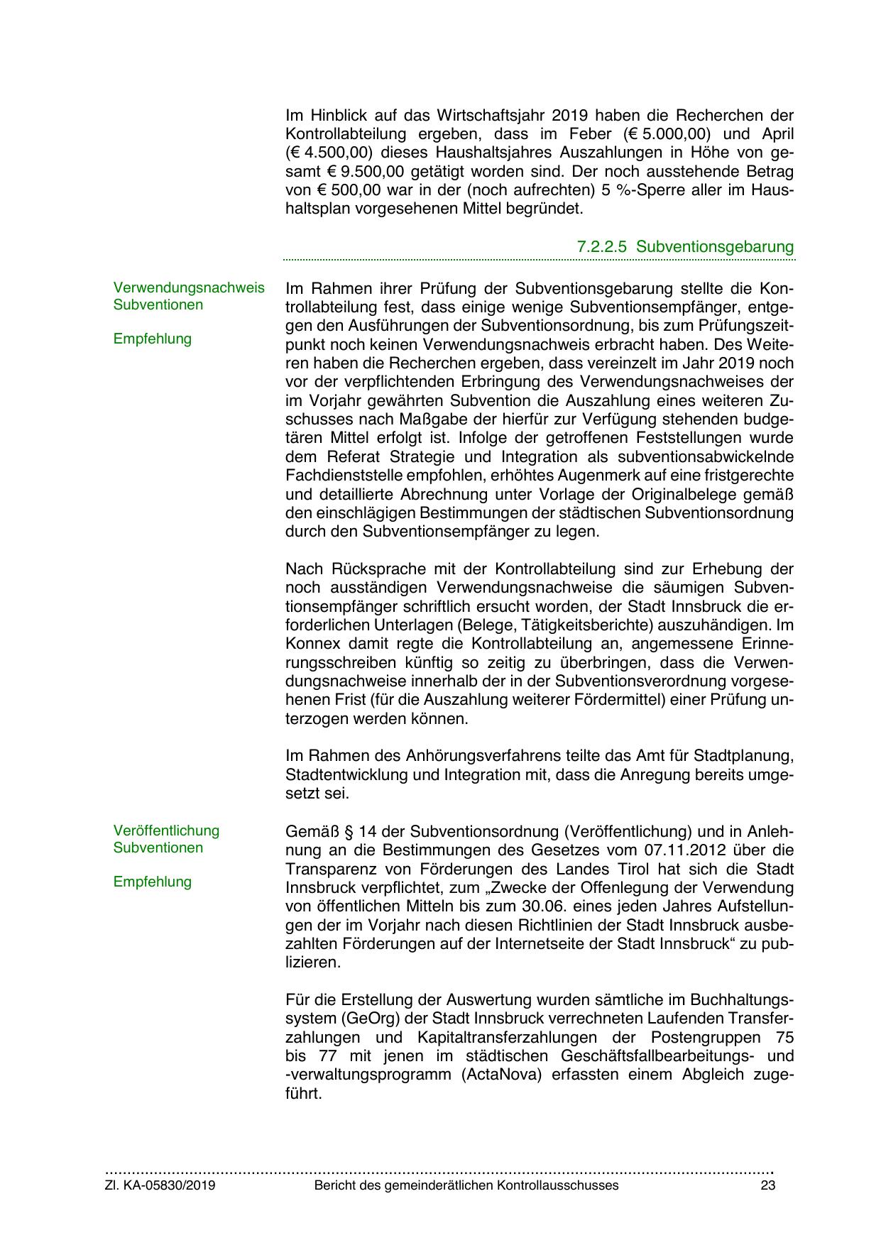 Im Rahmen ihrer Prüfung der Subventionsgebarung stellte die Kontrollabteilung fest, dass einige wenige Subventionsempfänger, entgegen den Ausführungen der Subventionsordnung, bis zum Prüfungszeitpunkt noch keinen Verwendungsnachweis erbracht haben. Des Weiteren haben die Recherchen ergeben, dass vereinzelt im Jahr 2019 noch