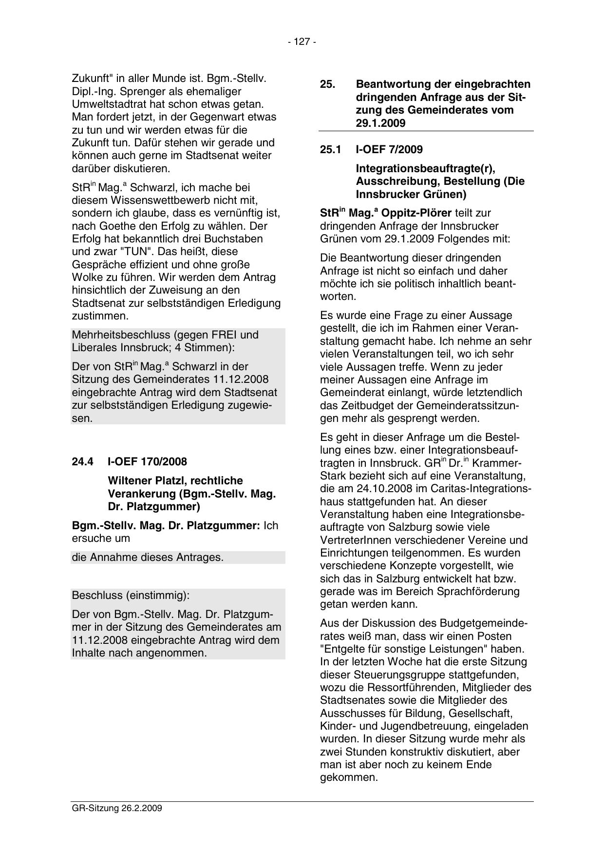 Es geht in dieser Anfrage um die Bestellung eines bzw. einer Integrationsbeauftragten in Innsbruck. GRin Dr.in KrammerStark bezieht sich auf eine Veranstaltung,