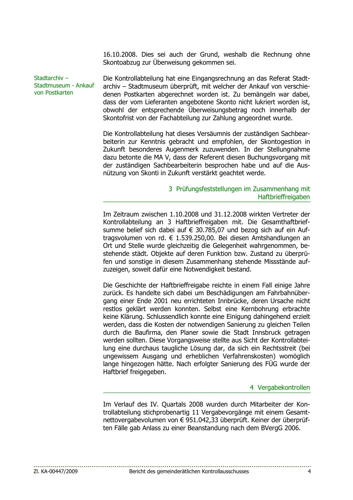 Im Verlauf des IV. Quartals 2008 wurden durch Mitarbeiter der Kontrollabteilung stichprobenartig 11 Vergabevorgänge mit einem Gesamtnettovergabevolumen von € 951.042,33 überprüft. Keiner der überprüften Fälle gab Anlass zu einer Beanstandung nach dem BVergG 2006.