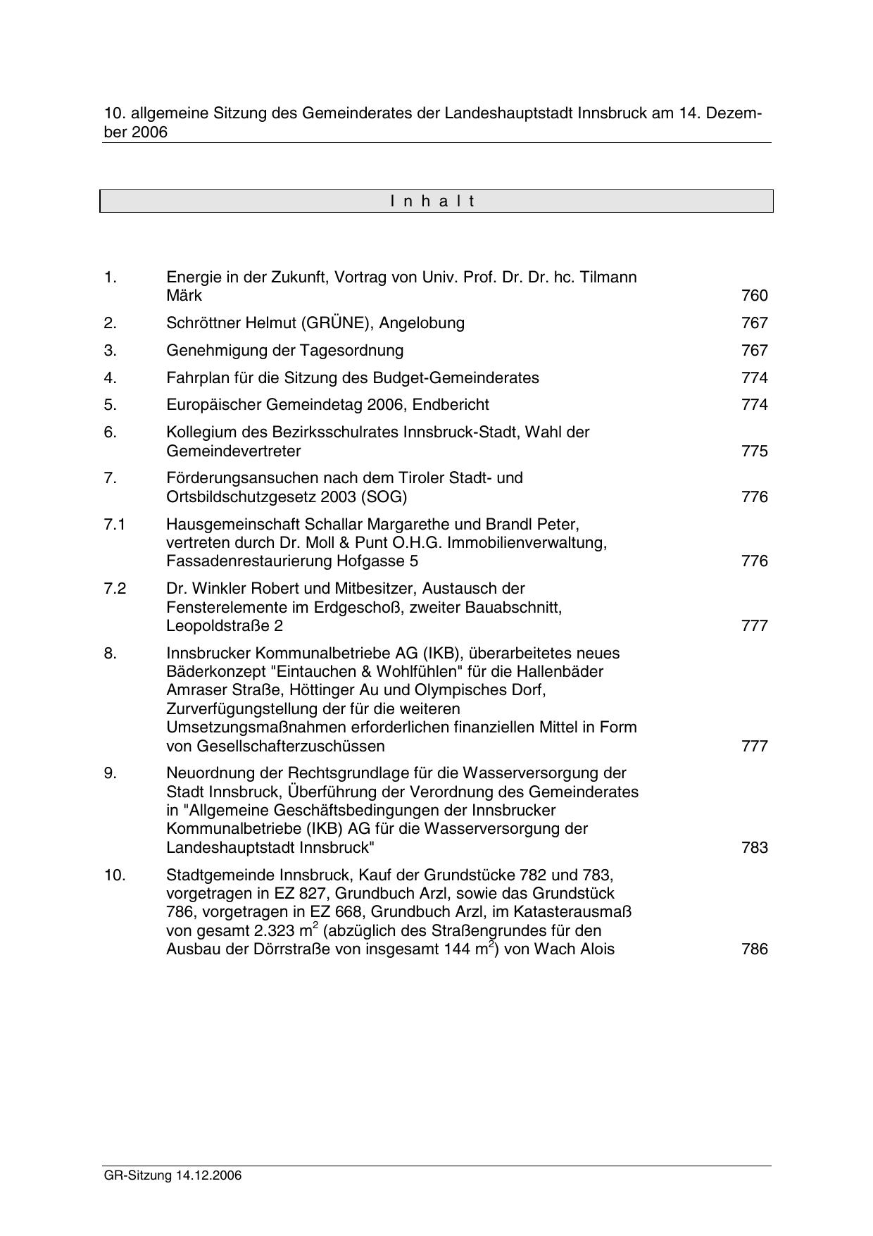 10. allgemeine Sitzung des Gemeinderates der Landeshauptstadt Innsbruck am 14. Dezember 2006