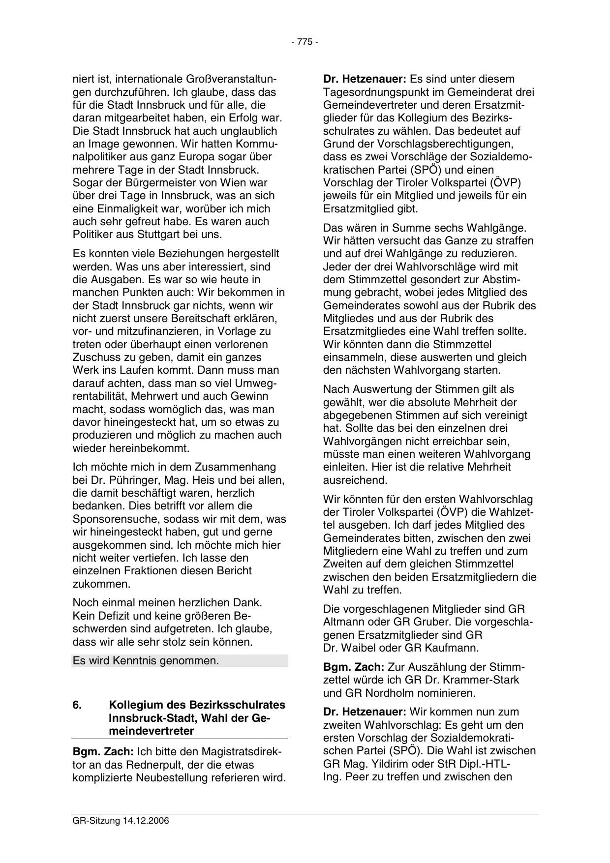 Bgm. Zach: Zur Auszählung der Stimmzettel würde ich GR Dr. Krammer-Stark