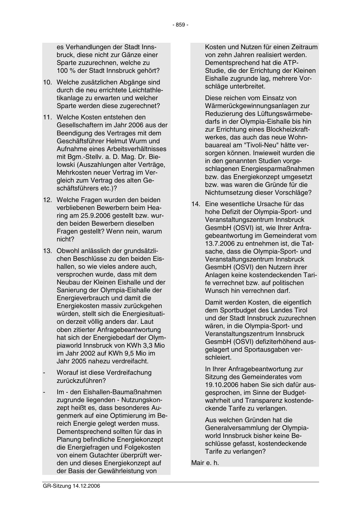 13. Obwohl anlässlich der grundsätzlichen Beschlüsse zu den beiden Eishallen, so wie vieles andere auch,