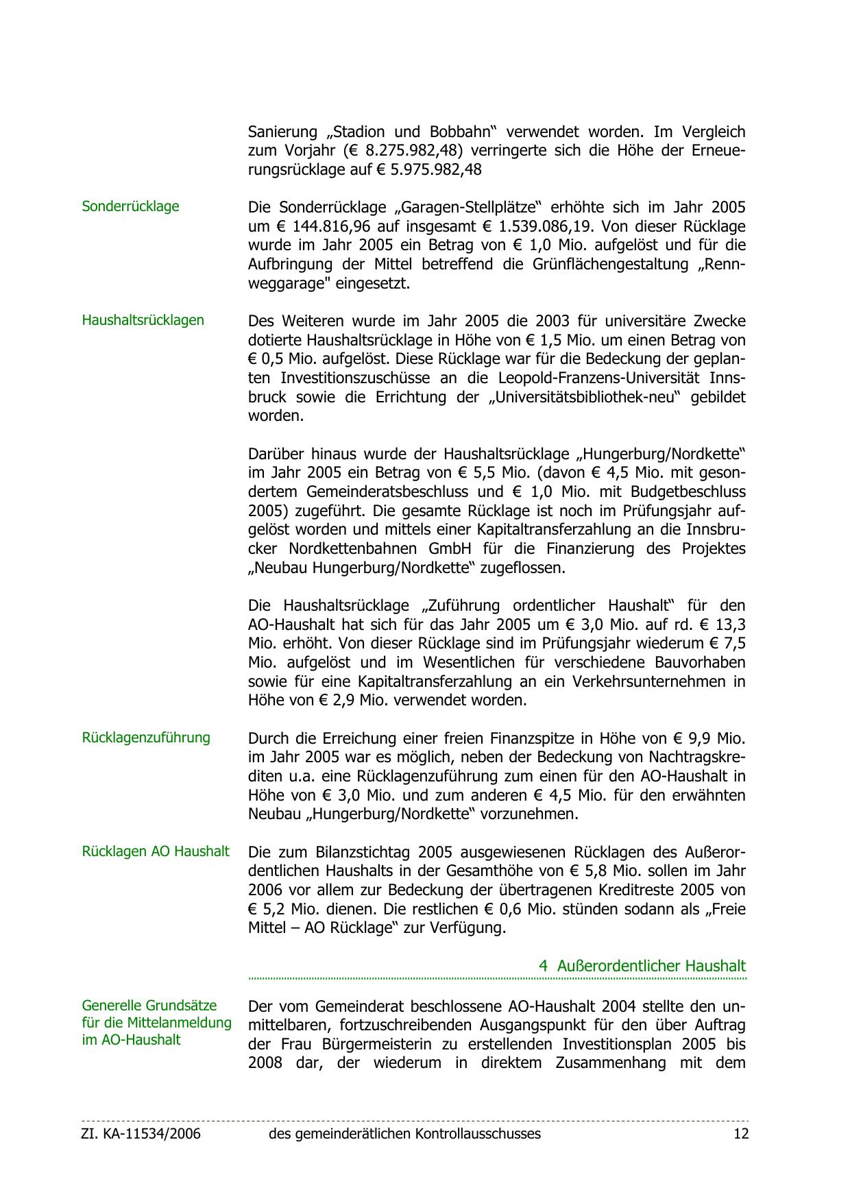 2005) zugeführt. Die gesamte Rücklage ist noch im Prüfungsjahr aufgelöst worden und mittels einer Kapitaltransferzahlung an die Innsbrucker Nordkettenbahnen GmbH für die Finanzierung des Projektes