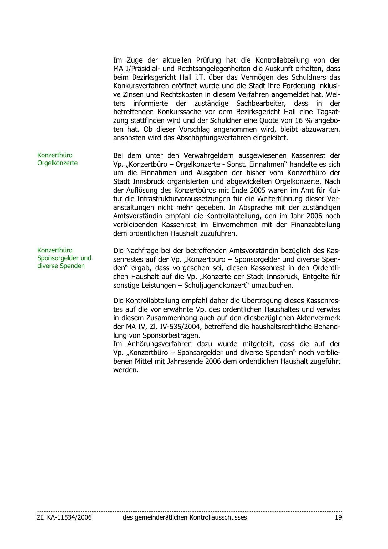 Die Nachfrage bei der betreffenden Amtsvorständin bezüglich des Kassenrestes auf der Vp. „Konzertbüro – Sponsorgelder und diverse Spenden“ ergab, dass vorgesehen sei, diesen Kassenrest in den Ordentlichen Haushalt auf die Vp. „Konzerte der Stadt Innsbruck, Entgelte für