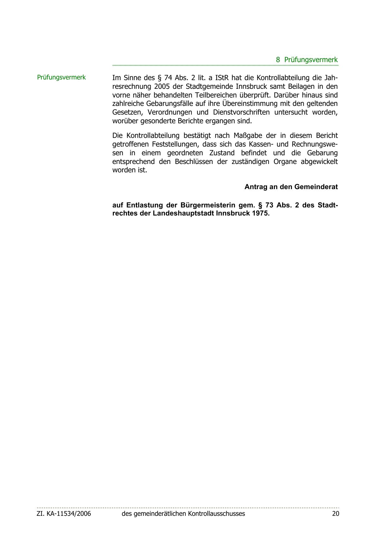 Im Sinne des § 74 Abs. 2 lit. a IStR hat die Kontrollabteilung die Jahresrechnung 2005 der Stadtgemeinde Innsbruck samt Beilagen in den