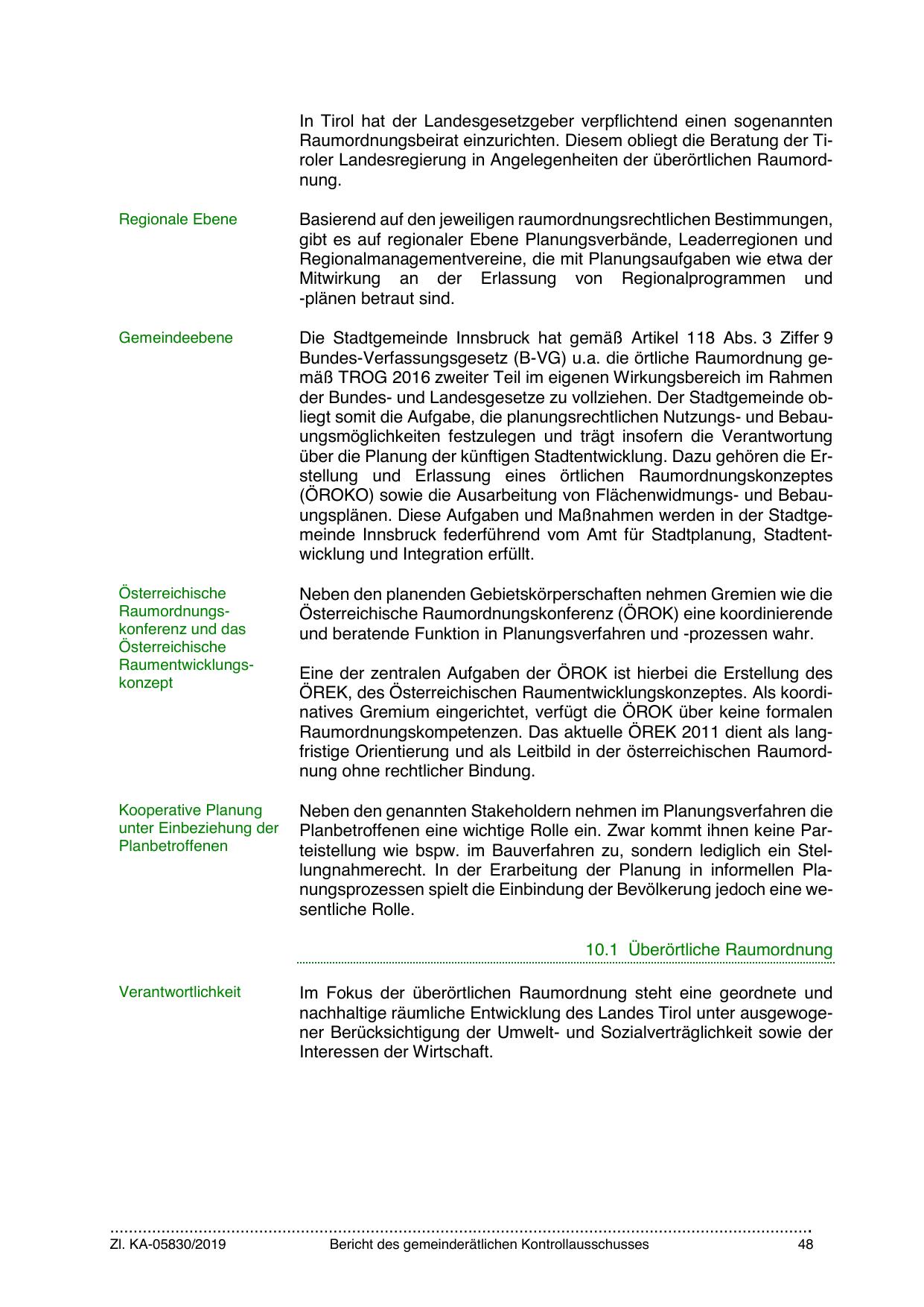 (ÖROKO) sowie die Ausarbeitung von Flächenwidmungs- und Bebauungsplänen. Diese Aufgaben und Maßnahmen werden in der Stadtgemeinde Innsbruck federführend vom Amt für Stadtplanung, Stadtentwicklung und Integration erfüllt.