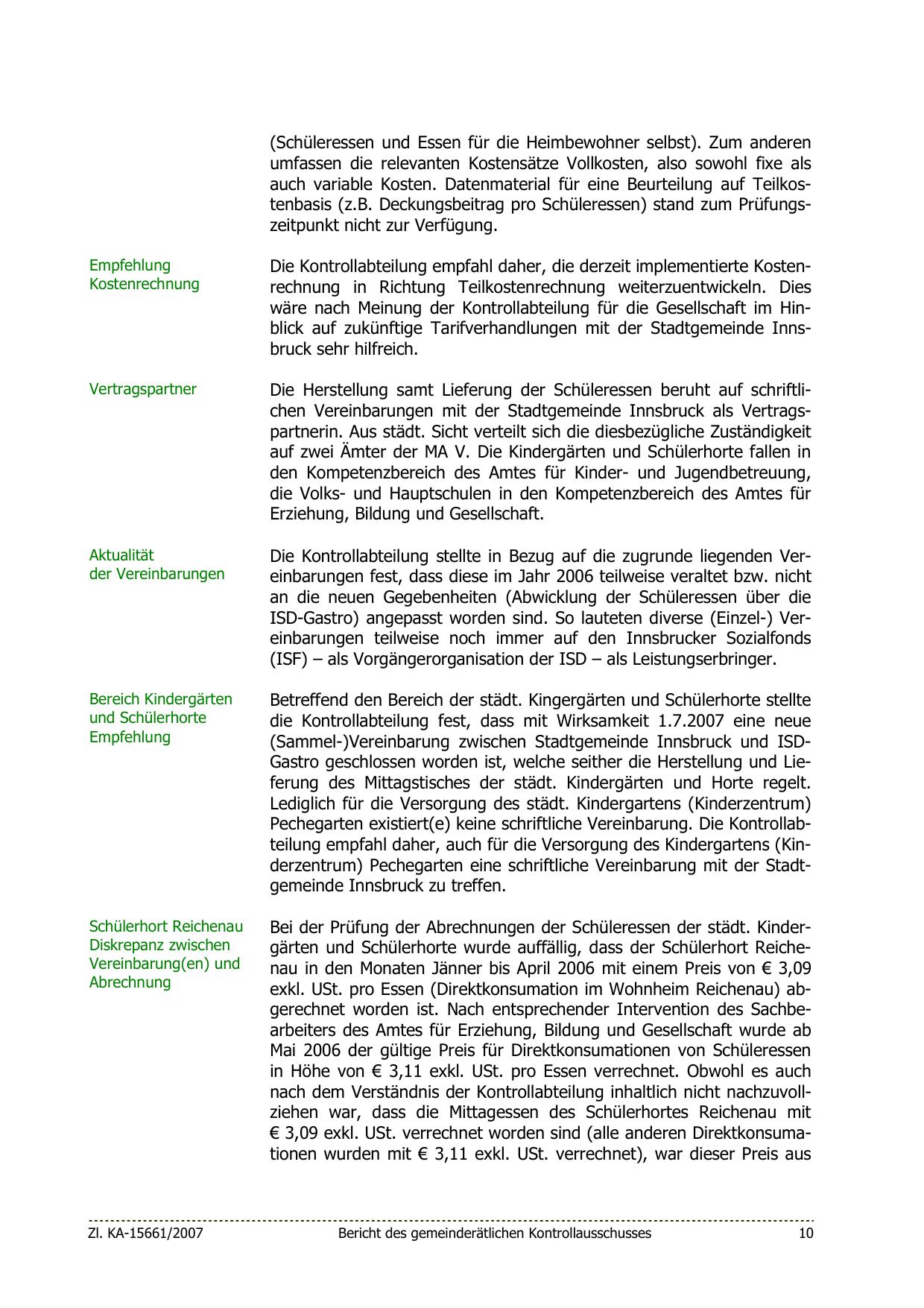Bei der Prüfung der Abrechnungen der Schüleressen der städt. Kindergärten und Schülerhorte wurde auffällig, dass der Schülerhort Reichenau in den Monaten Jänner bis April 2006 mit einem Preis von € 3,09