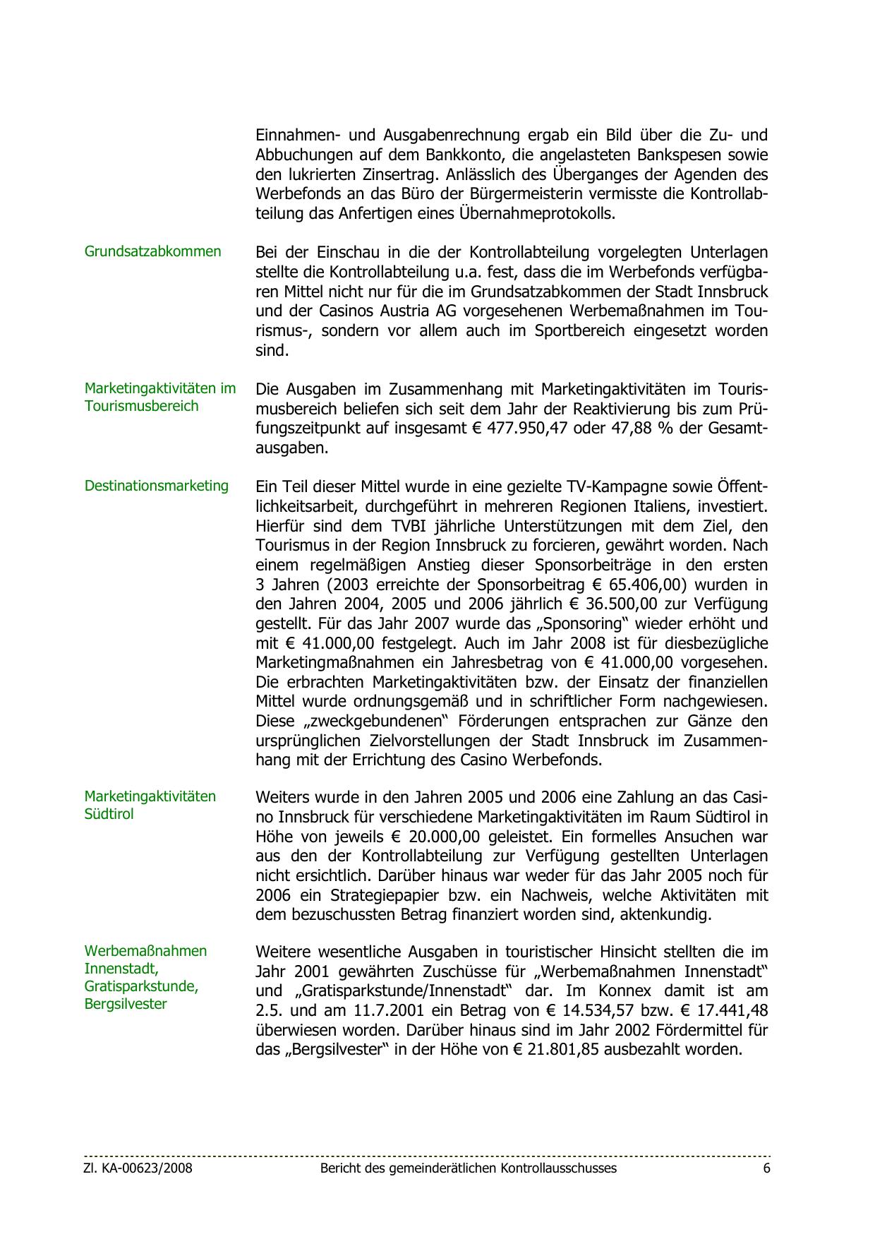 stellte die Kontrollabteilung u.a. fest, dass die im Werbefonds verfügbaren Mittel nicht nur für die im Grundsatzabkommen der Stadt Innsbruck