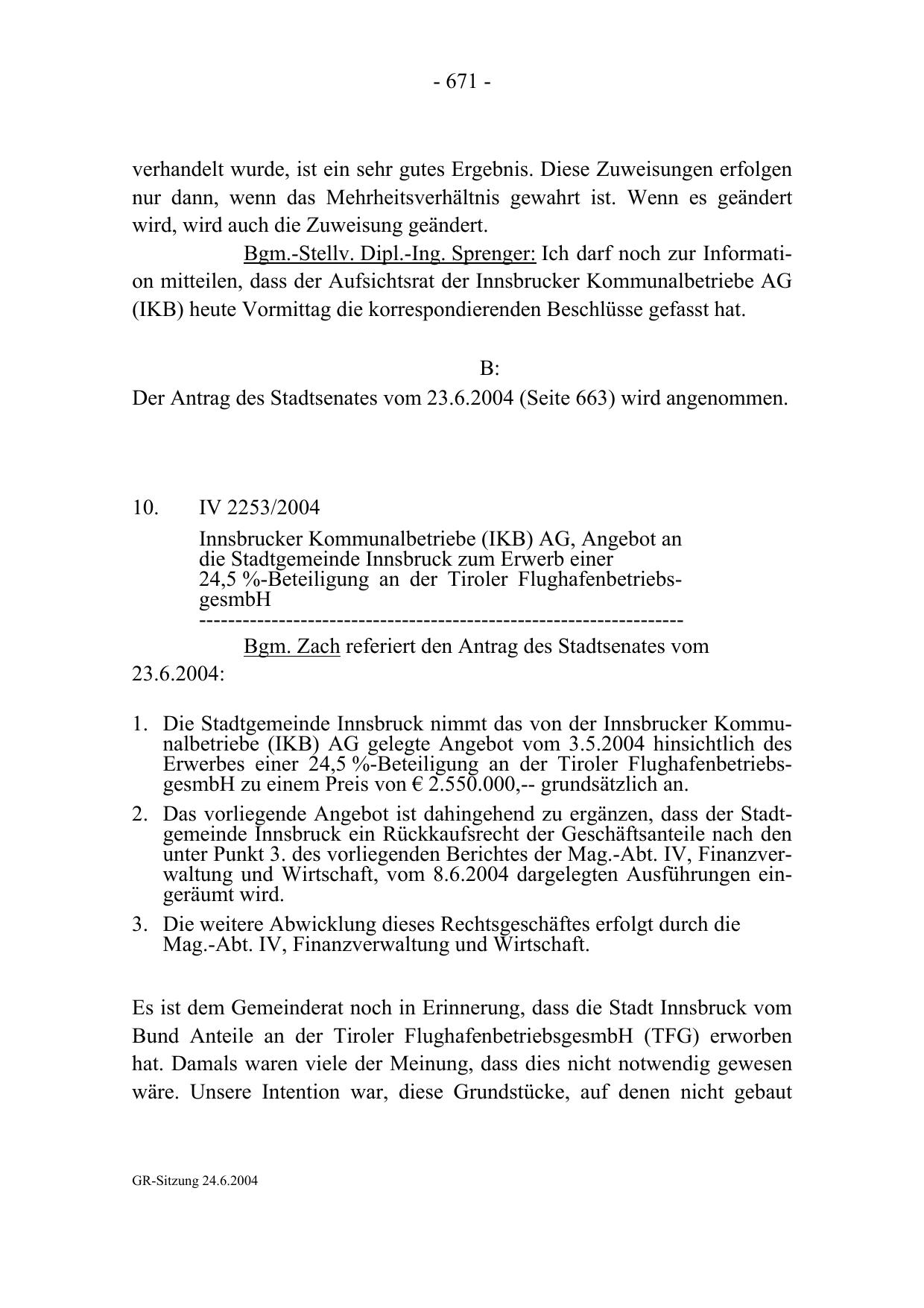 Bgm.-Stellv. Dipl.-Ing. Sprenger: Ich darf noch zur Information mitteilen, dass der Aufsichtsrat der Innsbrucker Kommunalbetriebe AG
