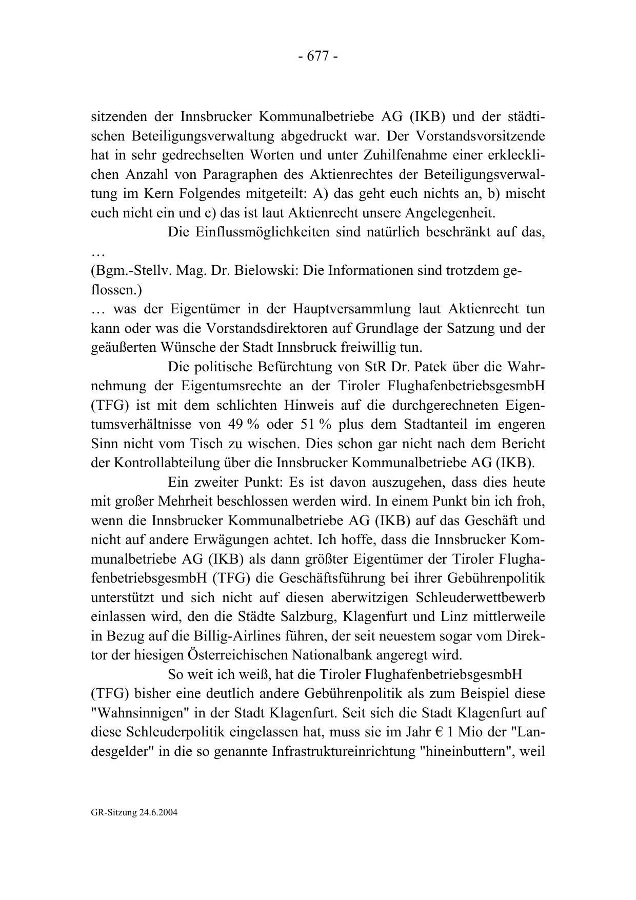 nicht auf andere Erwägungen achtet. Ich hoffe, dass die Innsbrucker Kommunalbetriebe AG (IKB) als dann größter Eigentümer der Tiroler FlughafenbetriebsgesmbH (TFG) die Geschäftsführung bei ihrer Gebührenpolitik