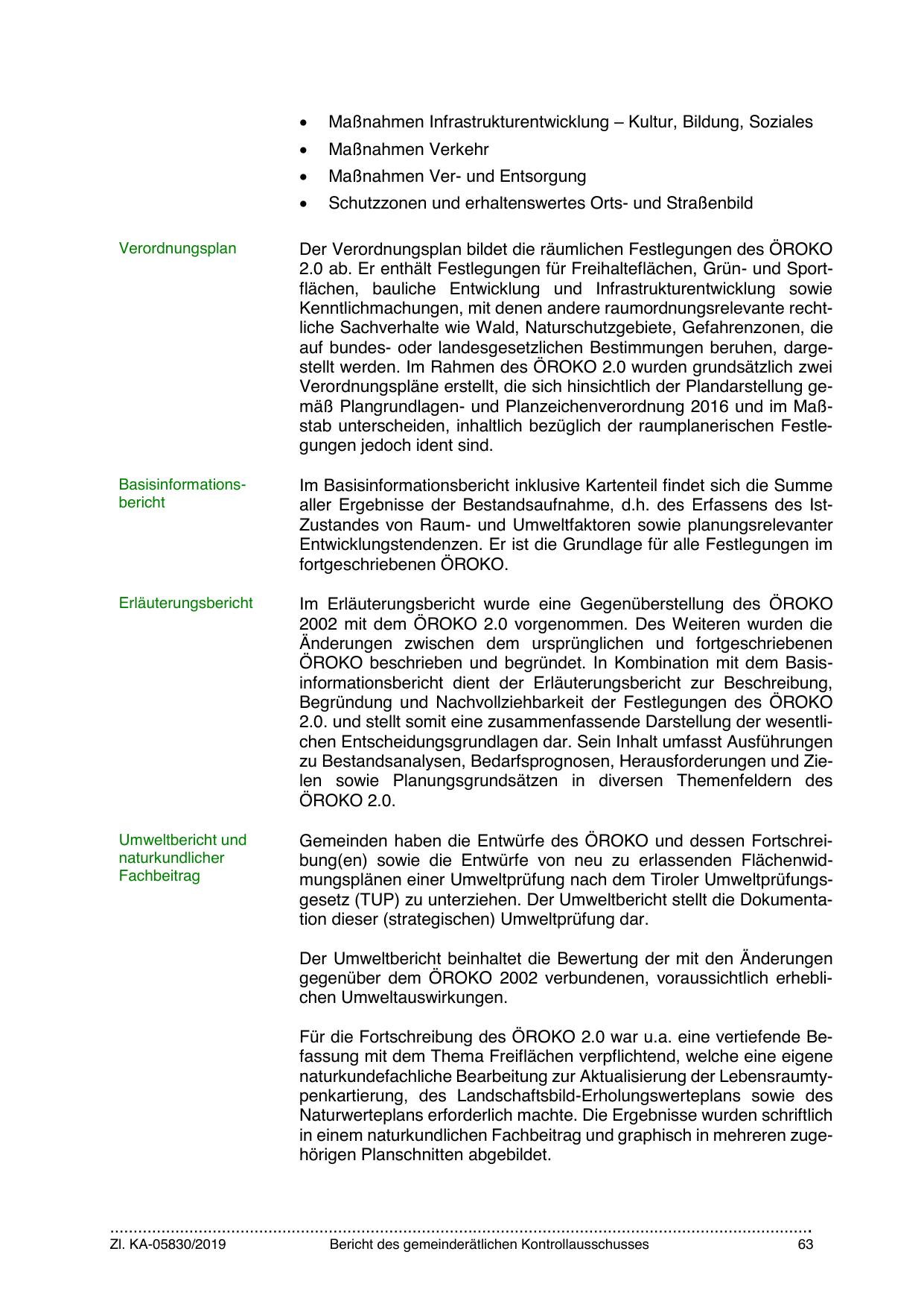 Gemeinden haben die Entwürfe des ÖROKO und dessen Fortschreibung(en) sowie die Entwürfe von neu zu erlassenden Flächenwidmungsplänen einer Umweltprüfung nach dem Tiroler Umweltprüfungsgesetz (TUP) zu unterziehen. Der Umweltbericht stellt die Dokumentation dieser (strategischen) Umweltprüfung dar.