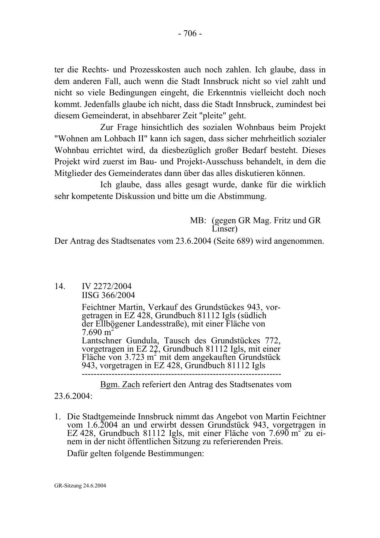 Der Antrag des Stadtsenates vom 23.6.2004 (Seite 689) wird angenommen.