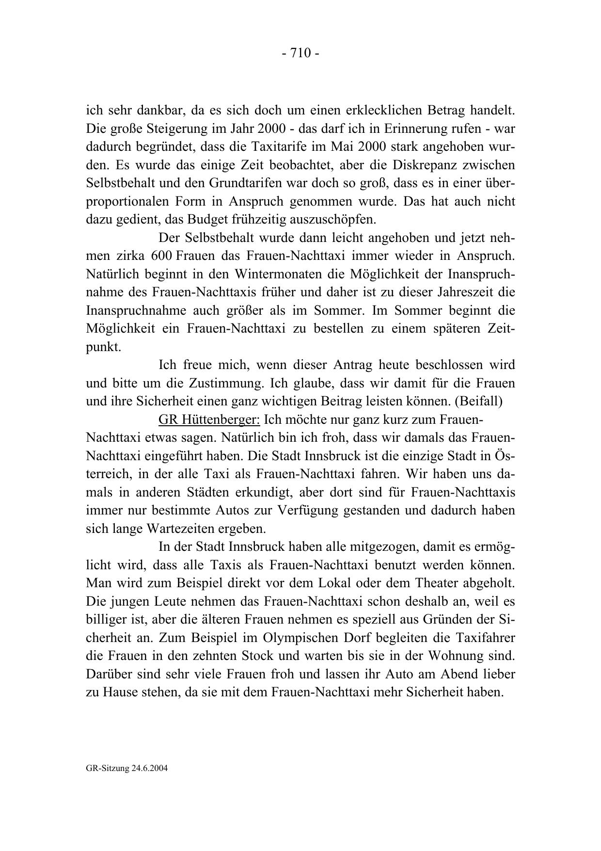 GR Hüttenberger: Ich möchte nur ganz kurz zum FrauenNachttaxi etwas sagen. Natürlich bin ich froh, dass wir damals das FrauenNachttaxi eingeführt haben. Die Stadt Innsbruck ist die einzige Stadt in Österreich, in der alle Taxi als Frauen-Nachttaxi fahren. Wir haben uns damals in anderen Städten erkundigt, aber dort sind für Frauen-Nachttaxis