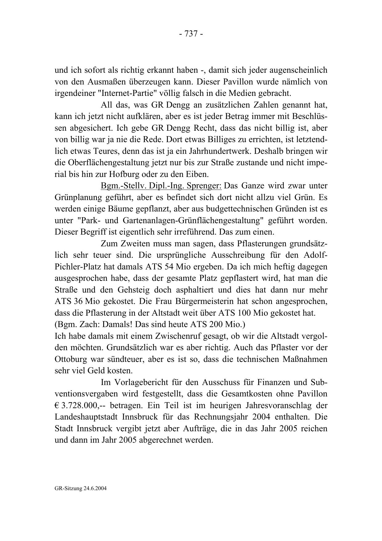 Zum Zweiten muss man sagen, dass Pflasterungen grundsätzlich sehr teuer sind. Die ursprüngliche Ausschreibung für den AdolfPichler-Platz hat damals ATS 54 Mio ergeben. Da ich mich heftig dagegen