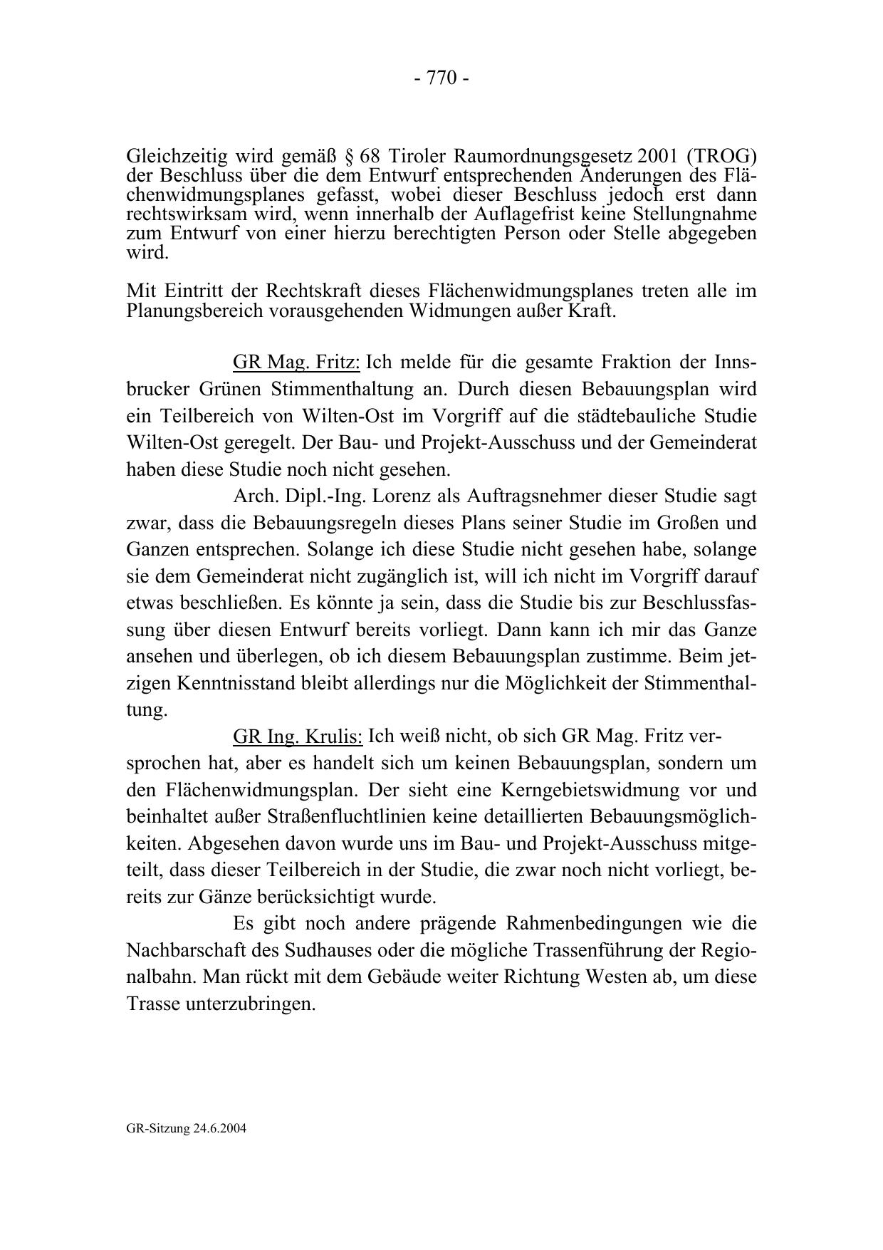 GR Mag. Fritz: Ich melde für die gesamte Fraktion der Innsbrucker Grünen Stimmenthaltung an. Durch diesen Bebauungsplan wird