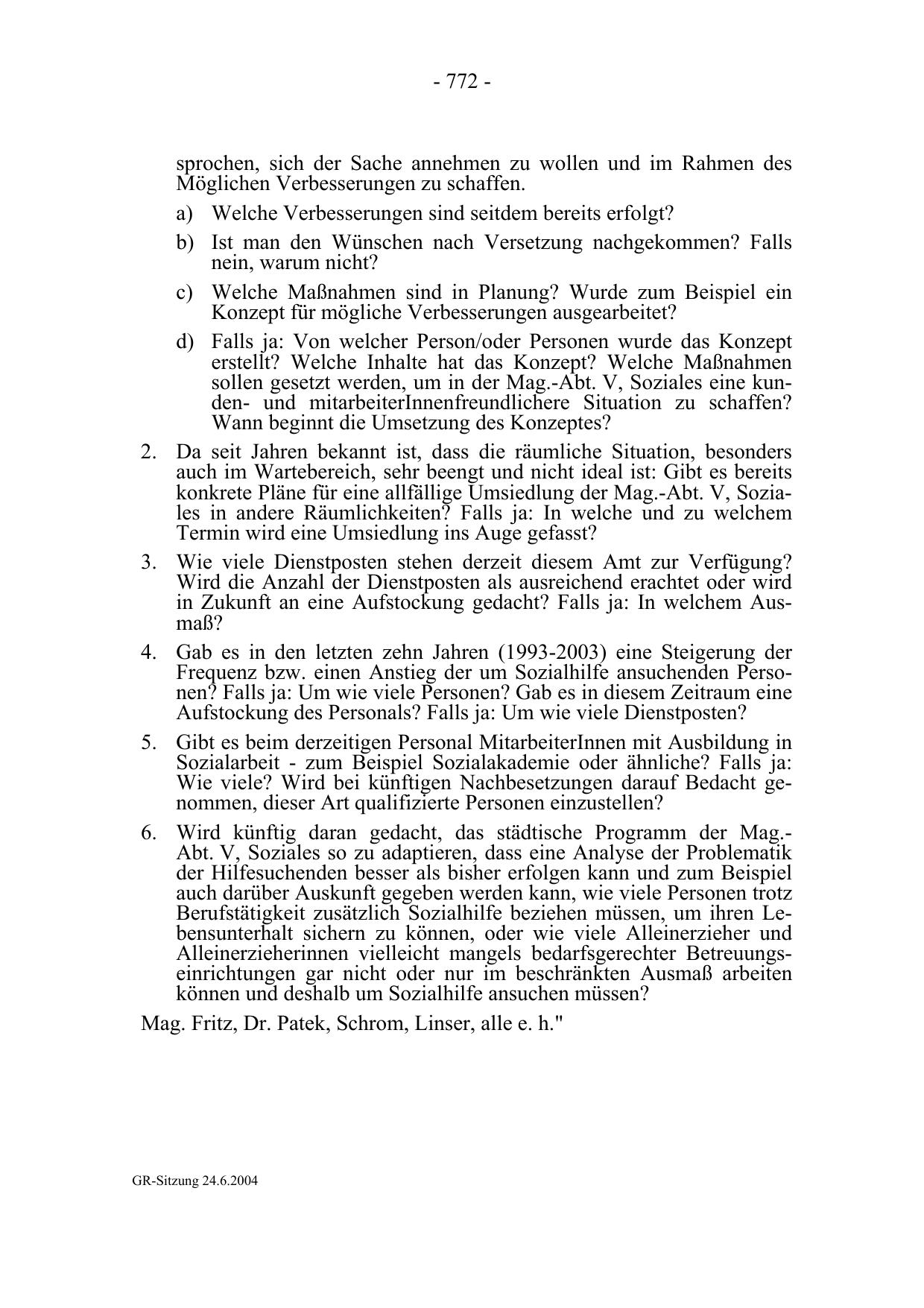 6. Wird künftig daran gedacht, das städtische Programm der Mag.Abt. V, Soziales so zu adaptieren, dass eine Analyse der Problematik
