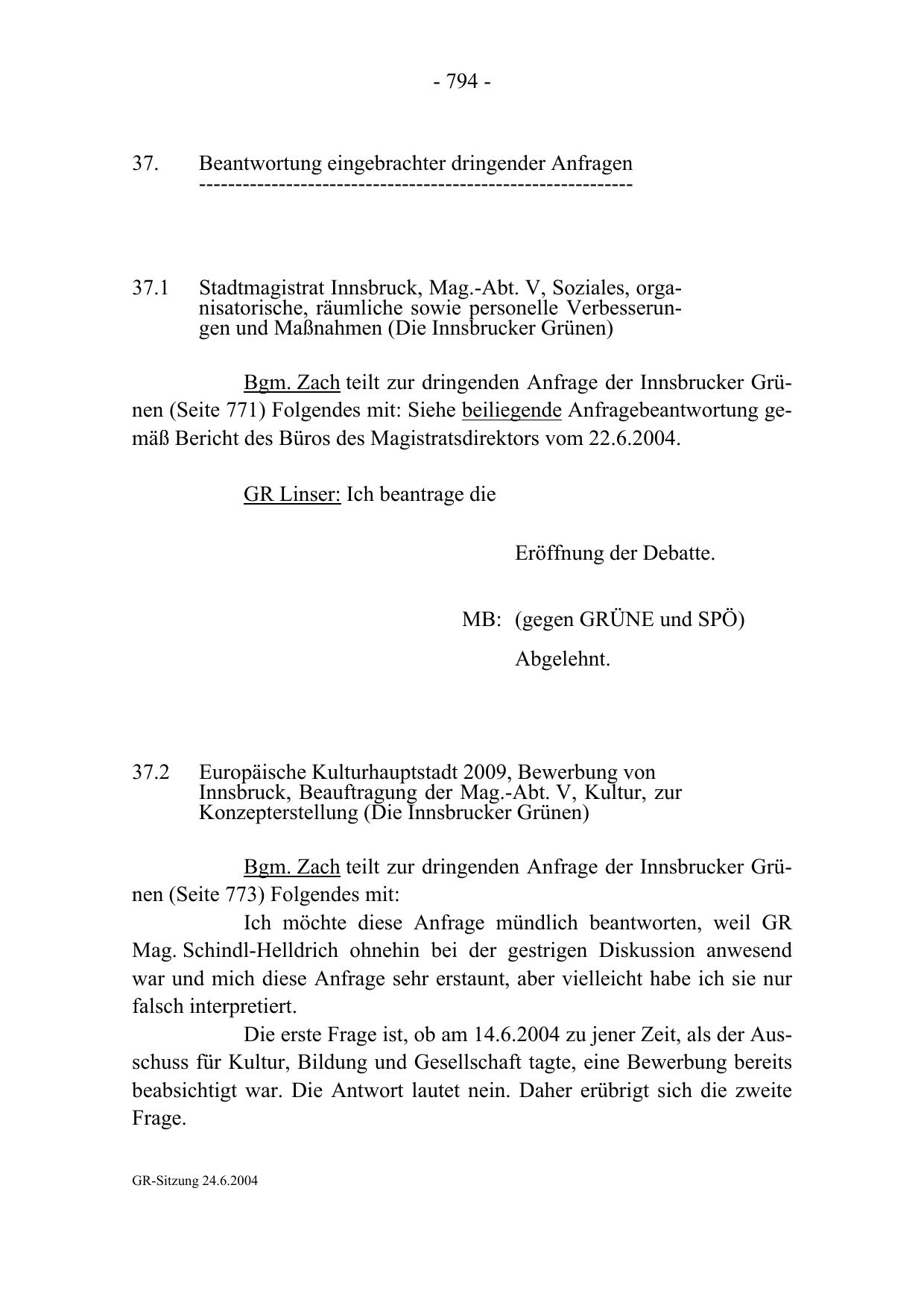 Bgm. Zach teilt zur dringenden Anfrage der Innsbrucker Grünen (Seite 771) Folgendes mit: Siehe beiliegende Anfragebeantwortung gemäß Bericht des Büros des Magistratsdirektors vom 22.6.2004.