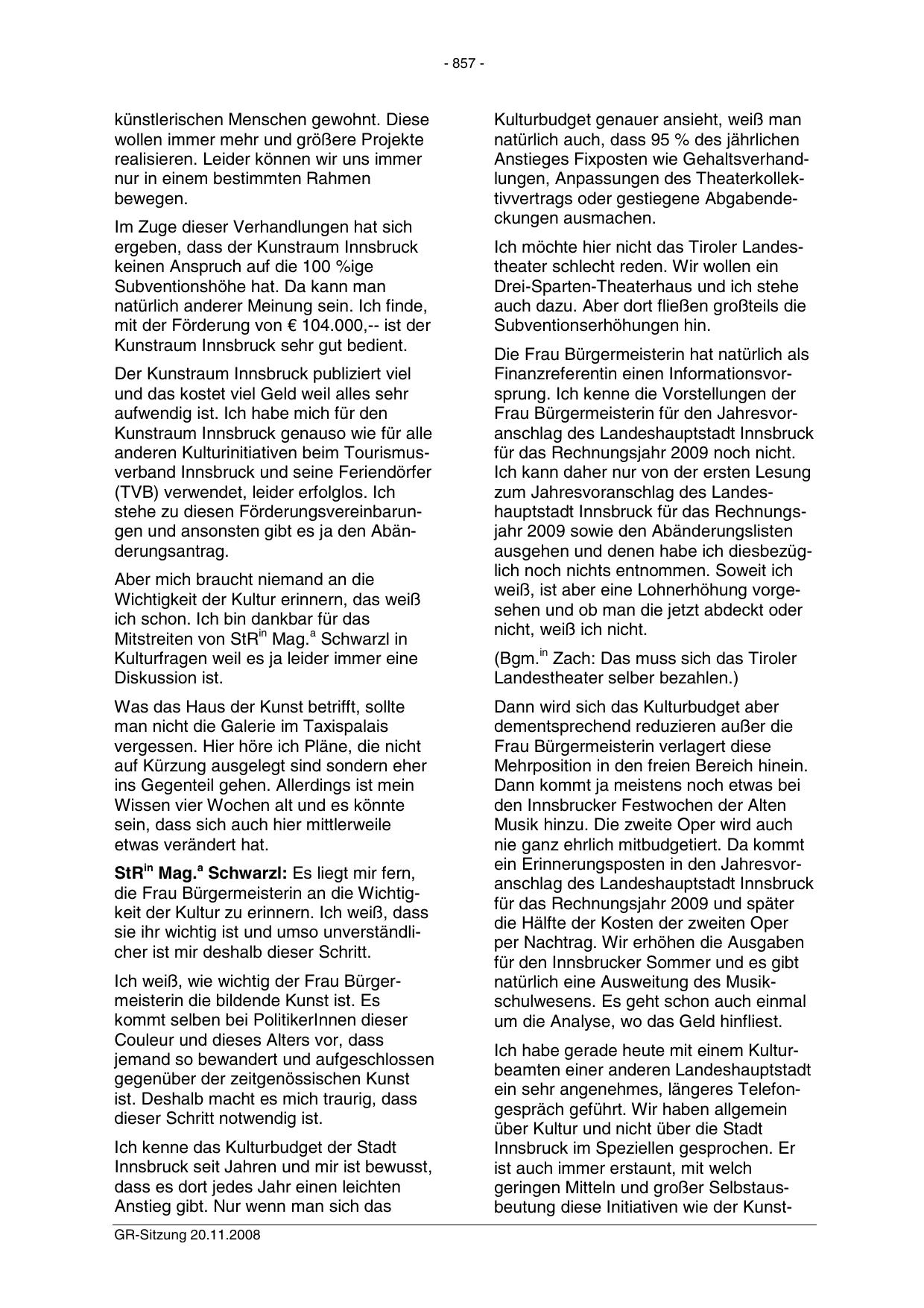 Frau Bürgermeisterin für den Jahresvoranschlag des Landeshauptstadt Innsbruck