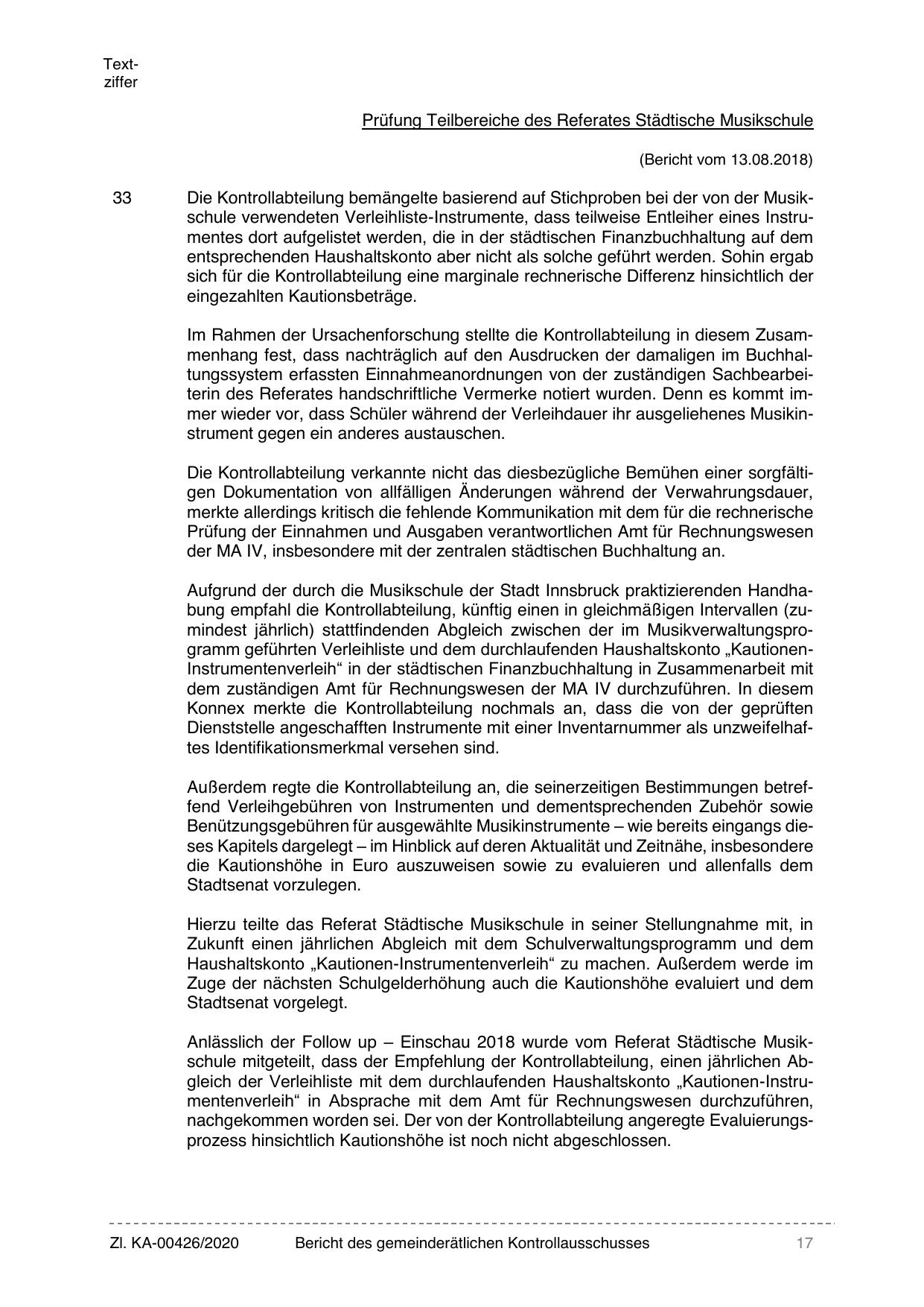 Aufgrund der durch die Musikschule der Stadt Innsbruck praktizierenden Handhabung empfahl die Kontrollabteilung, künftig einen in gleichmäßigen Intervallen (zumindest jährlich) stattfindenden Abgleich zwischen der im Musikverwaltungsprogramm geführten Verleihliste und dem durchlaufenden Haushaltskonto „KautionenInstrumentenverleih“ in der städtischen Finanzbuchhaltung in Zusammenarbeit mit