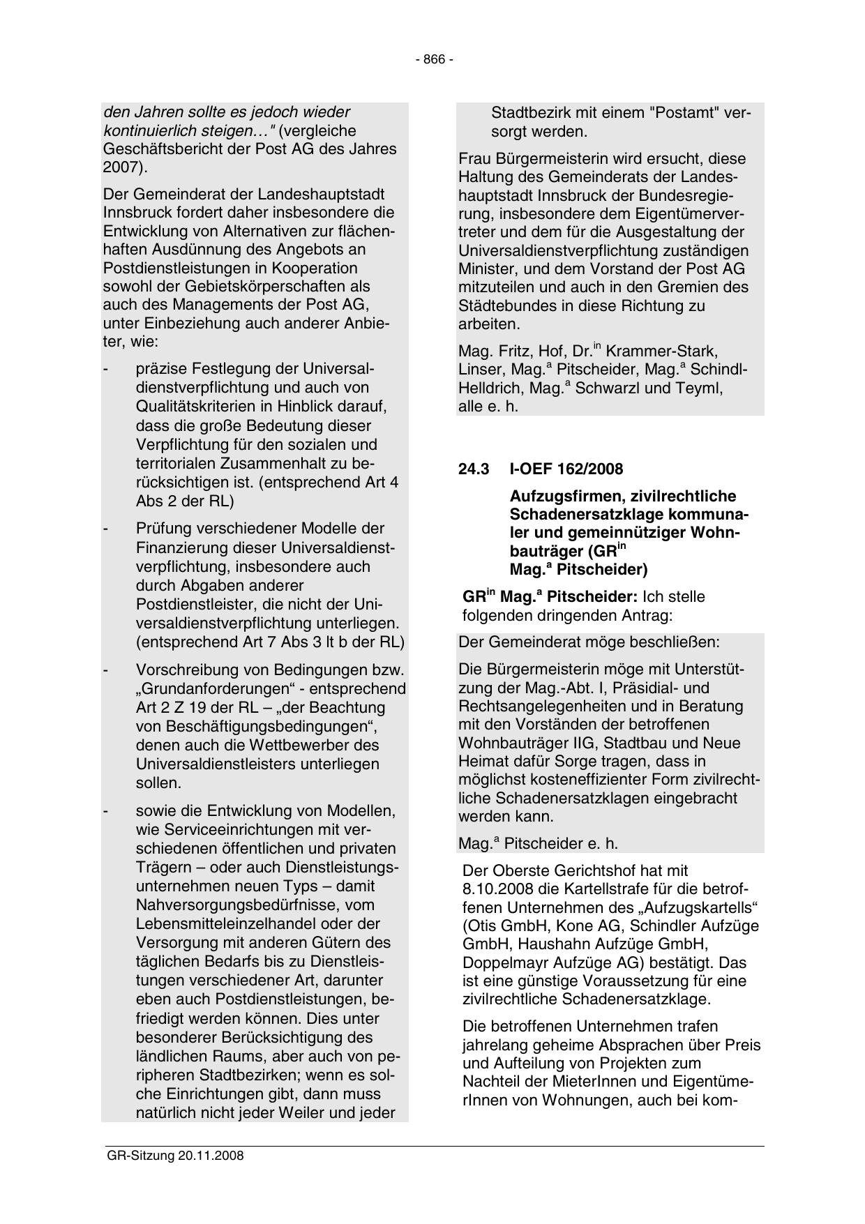 Haltung des Gemeinderats der Landeshauptstadt Innsbruck der Bundesregierung, insbesondere dem Eigentümervertreter und dem für die Ausgestaltung der