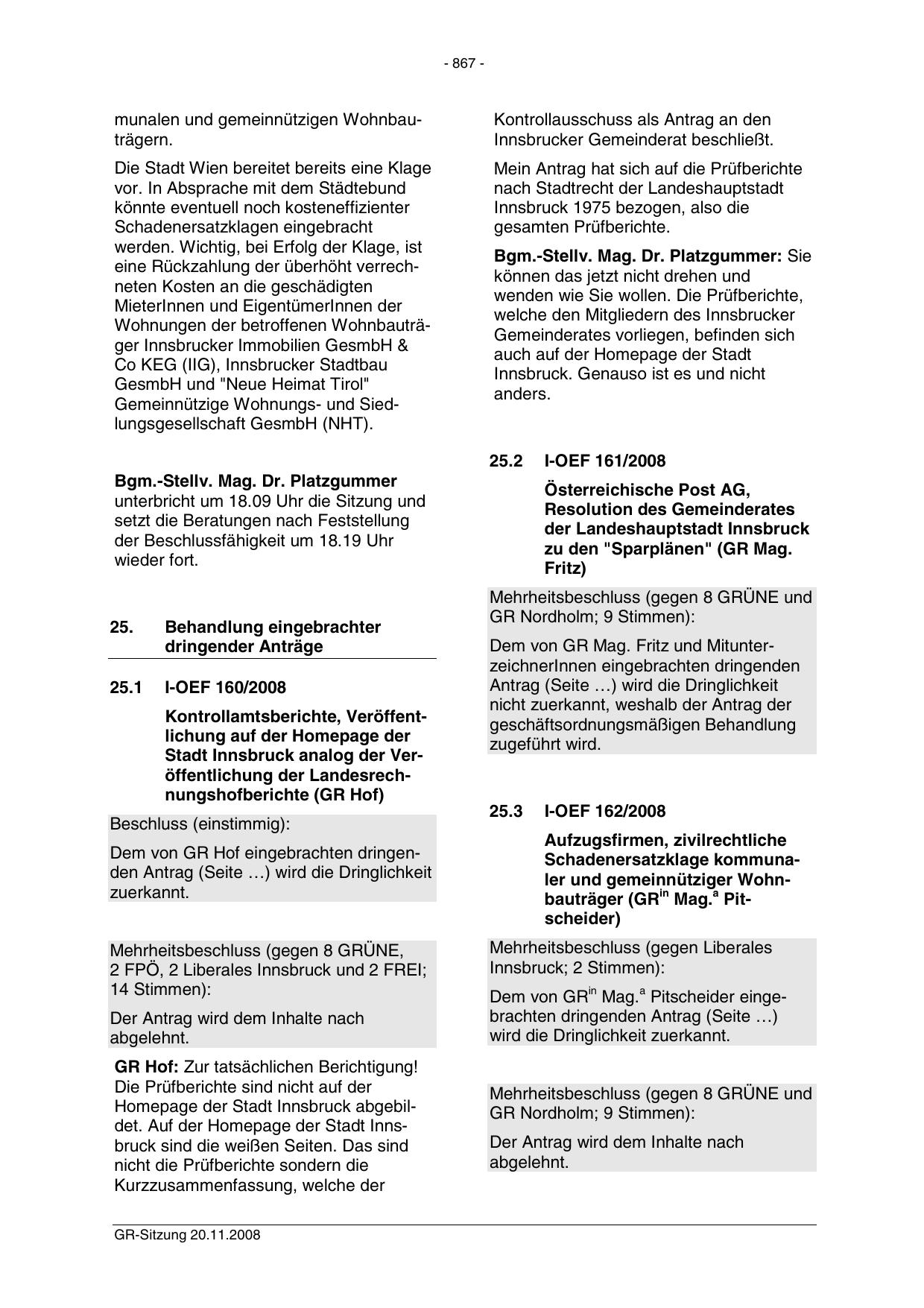 Stadt Innsbruck analog der Veröffentlichung der Landesrechnungshofberichte (GR Hof)