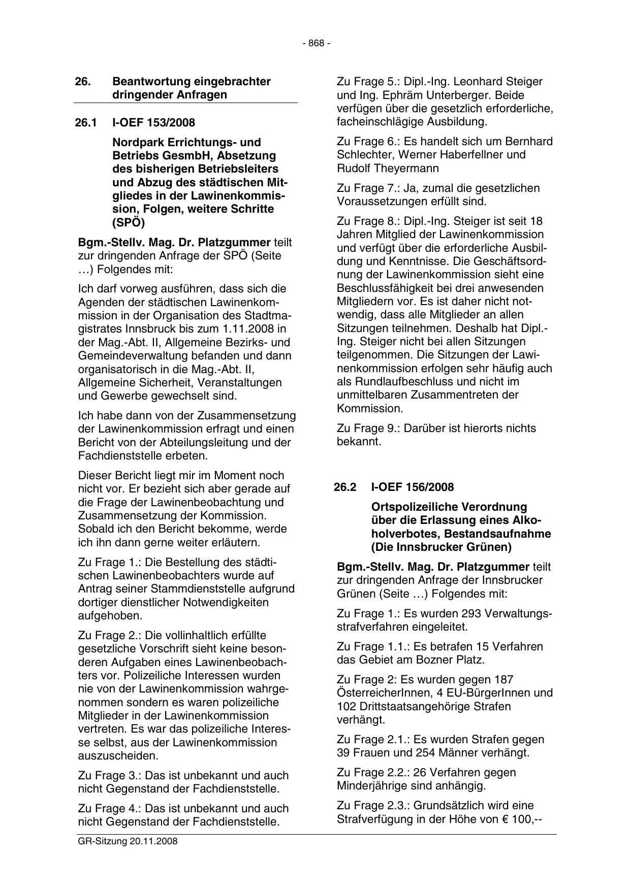 Agenden der städtischen Lawinenkommission in der Organisation des Stadtmagistrates Innsbruck bis zum 1.11.2008 in