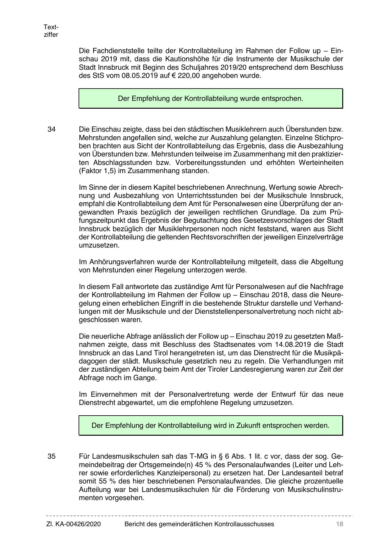 der Kontrollabteilung im Rahmen der Follow up – Einschau 2018, dass die Neuregelung einen erheblichen Eingriff in die bestehende Struktur darstelle und Verhandlungen mit der Musikschule und der Dienststellenpersonalvertretung noch nicht abgeschlossen waren.
