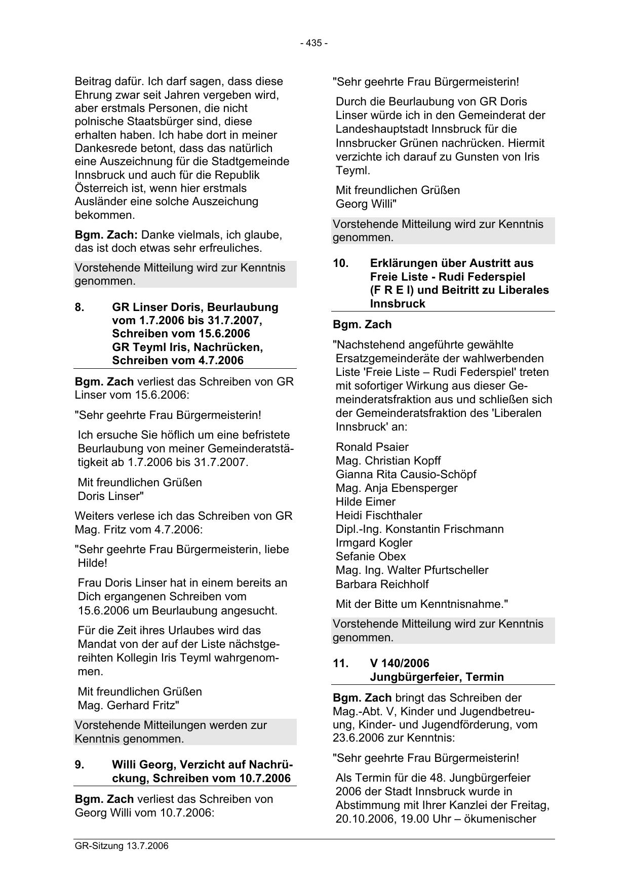 Beurlaubung von meiner Gemeinderatstätigkeit ab 1.7.2006 bis 31.7.2007.