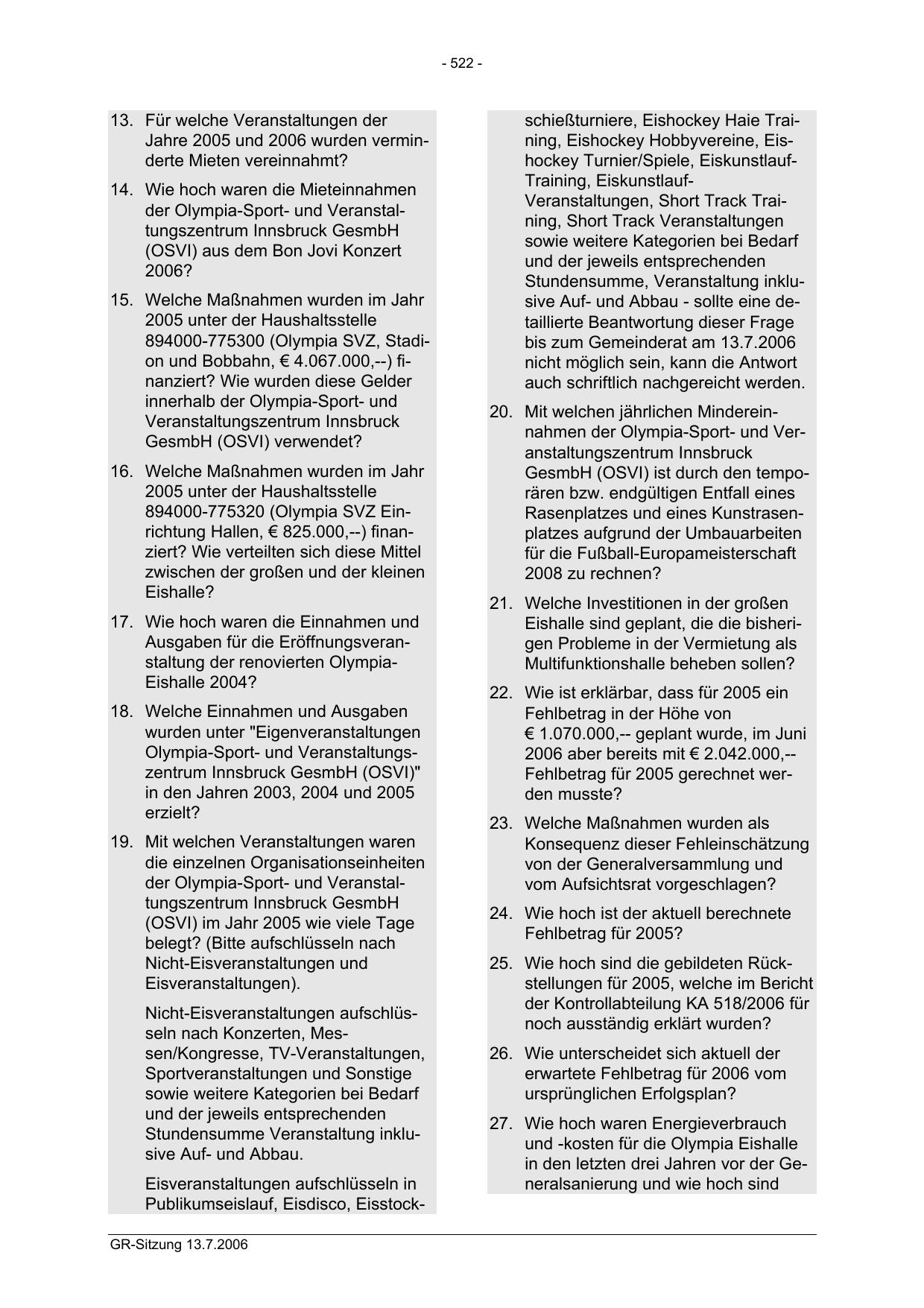 20. Mit welchen jährlichen Mindereinnahmen der Olympia-Sport- und Veranstaltungszentrum Innsbruck