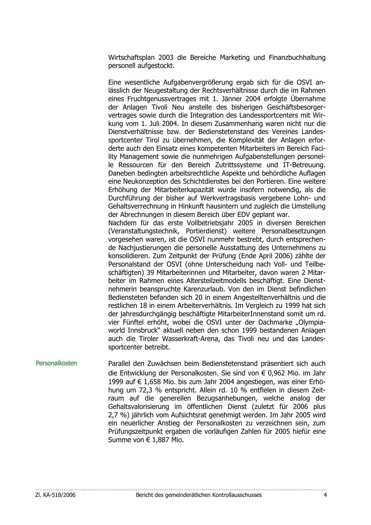 der Anlagen Tivoli Neu anstelle des bisherigen Geschäftsbesorgervertrages sowie durch die Integration des Landessportcenters mit Wirkung vom 1. Juli 2004. In diesem Zusammenhang waren nicht nur die