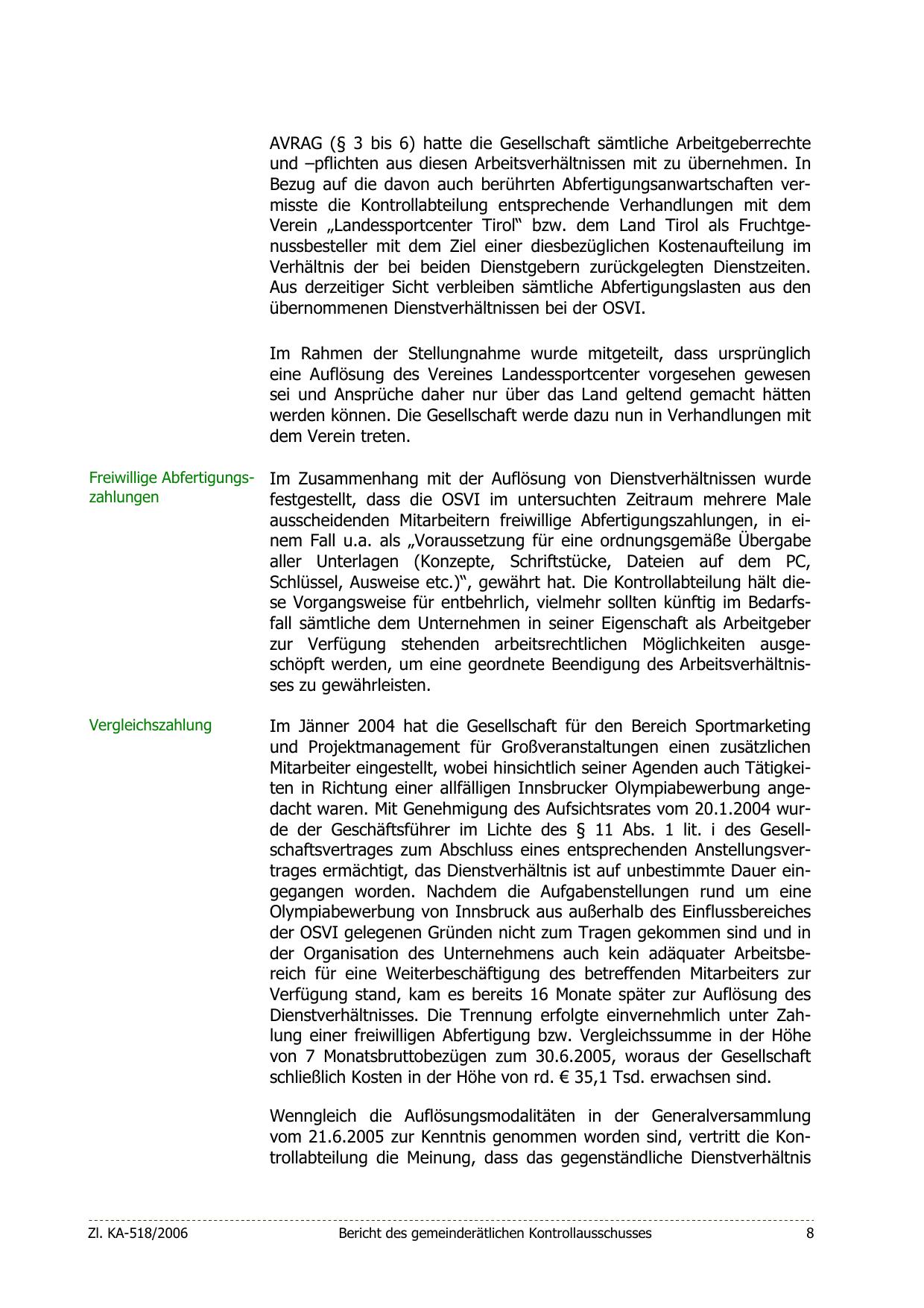 Bezug auf die davon auch berührten Abfertigungsanwartschaften vermisste die Kontrollabteilung entsprechende Verhandlungen mit dem