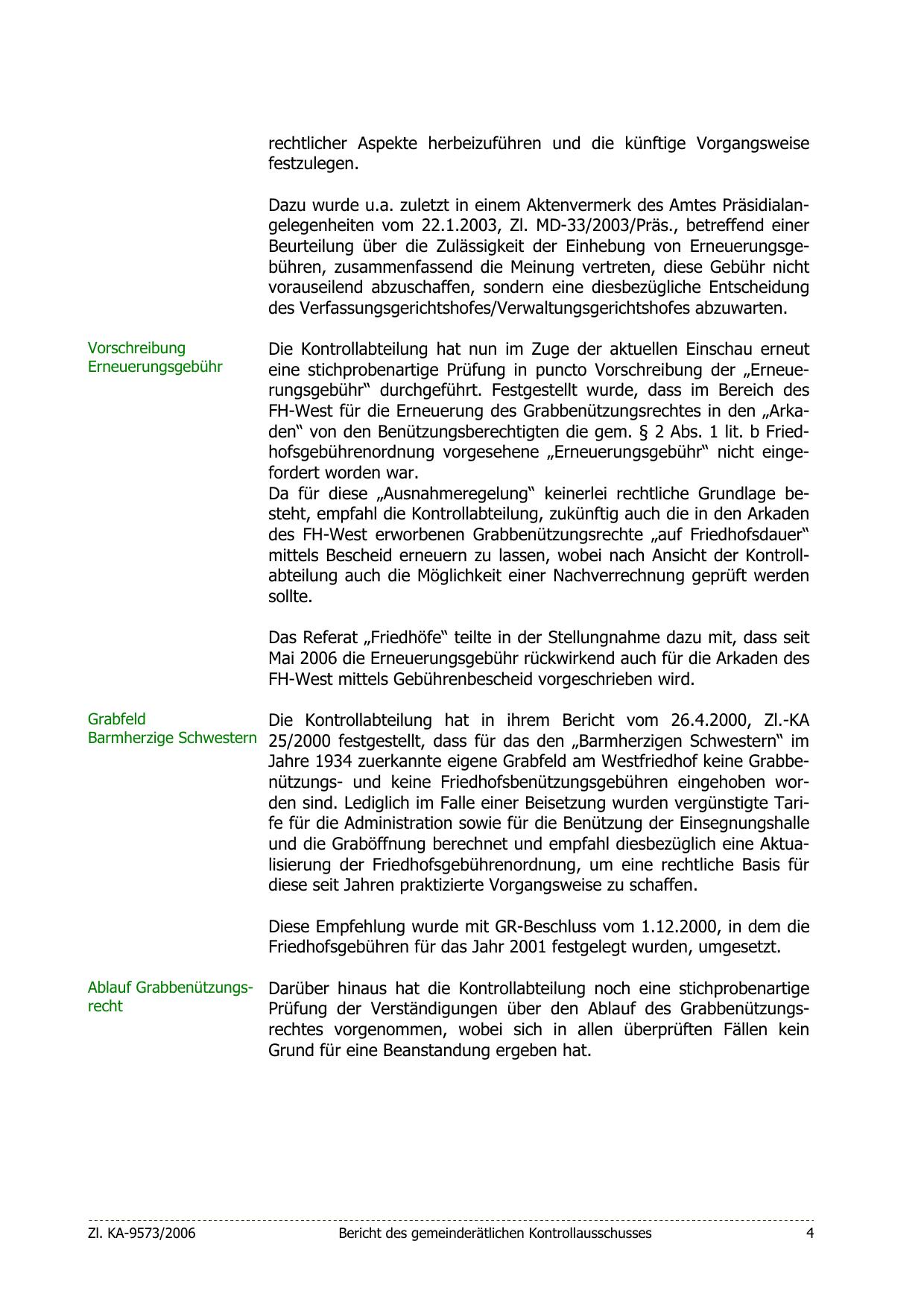 und die Graböffnung berechnet und empfahl diesbezüglich eine Aktualisierung der Friedhofsgebührenordnung, um eine rechtliche Basis für