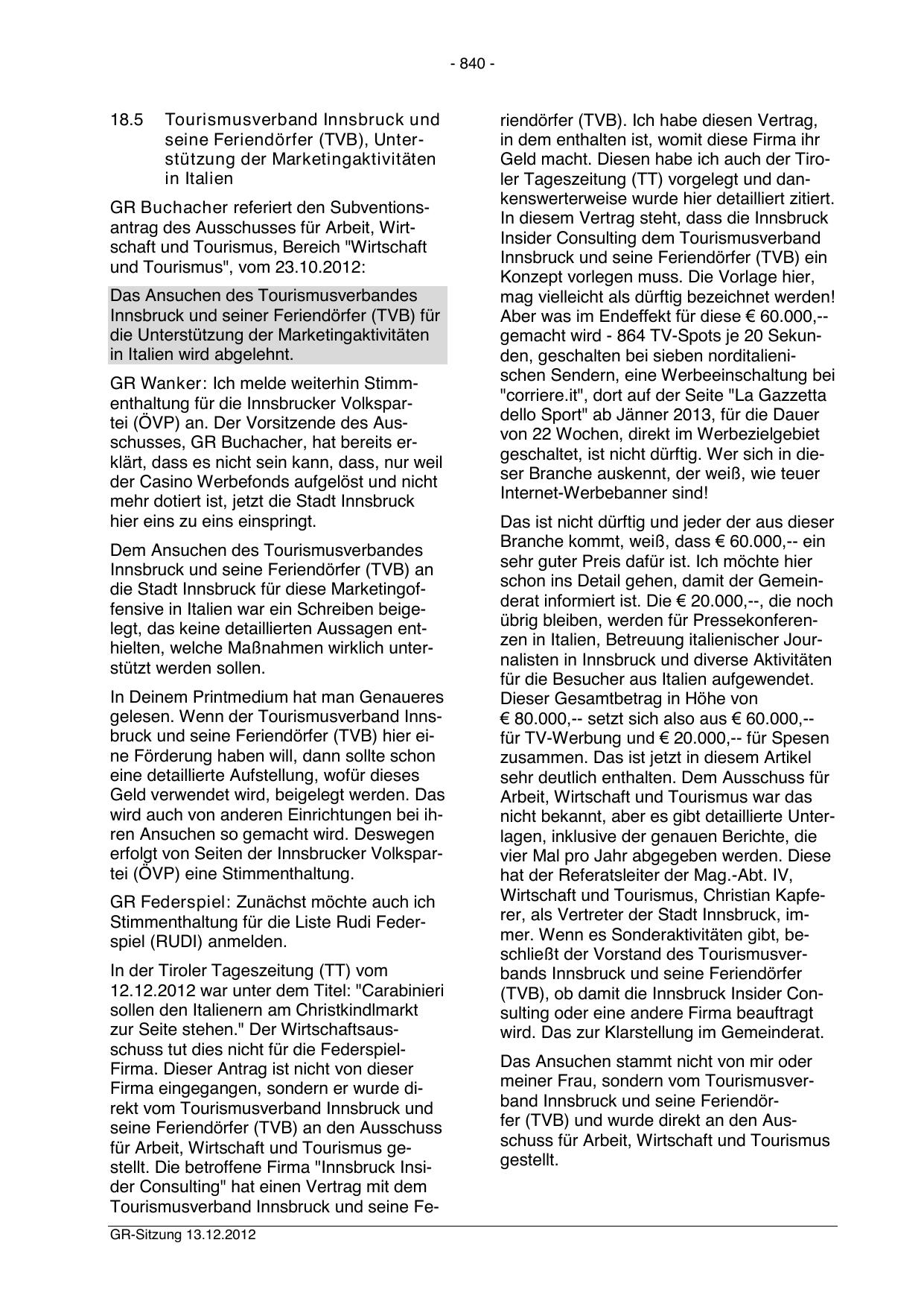 Tourismusverband Innsbruck und seine FeGR-Sitzung 13.12.2012