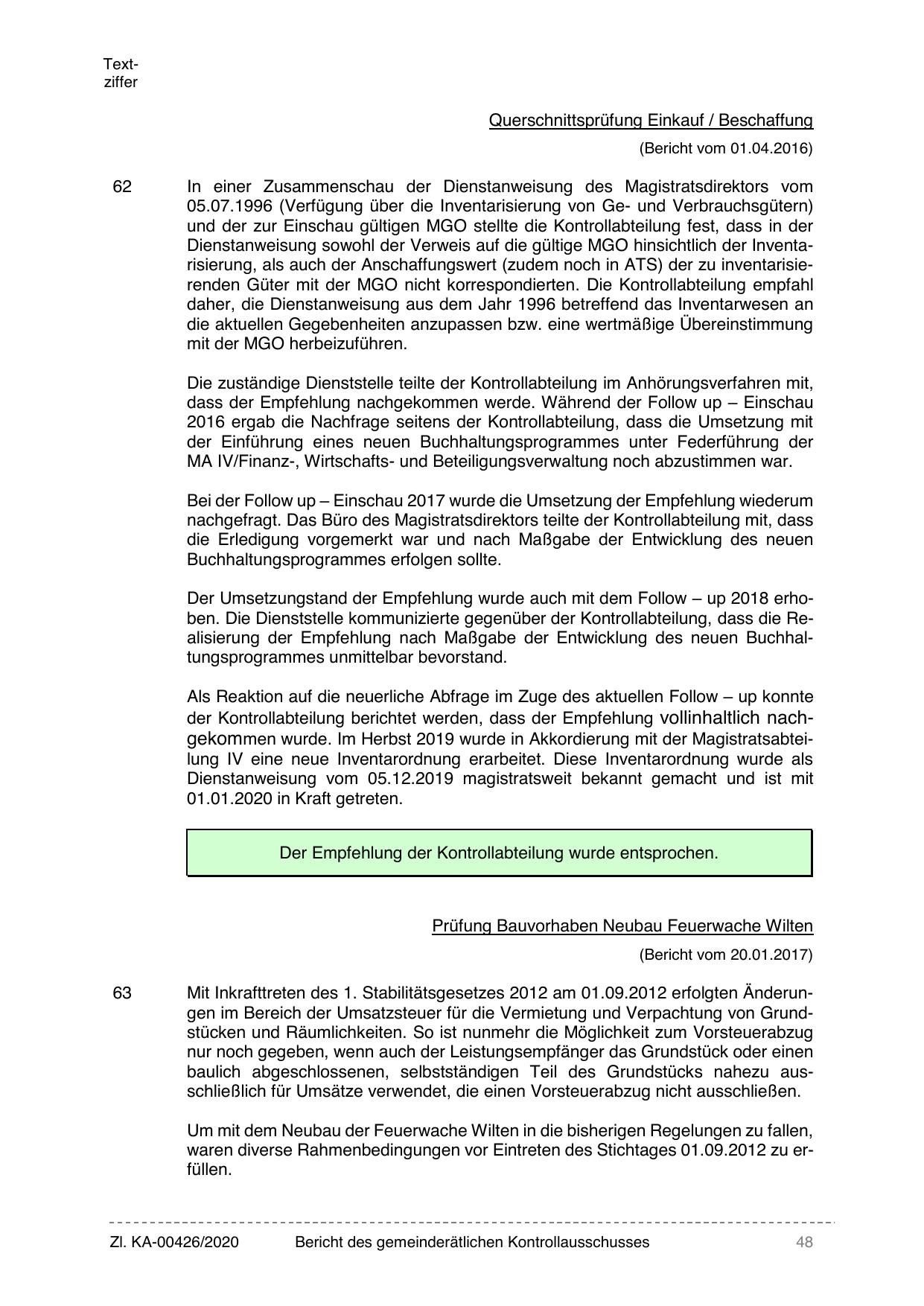 der Kontrollabteilung berichtet werden, dass der Empfehlung vollinhaltlich nachgekommen wurde. Im Herbst 2019 wurde in Akkordierung mit der Magistratsabteilung IV eine neue Inventarordnung erarbeitet. Diese Inventarordnung wurde als