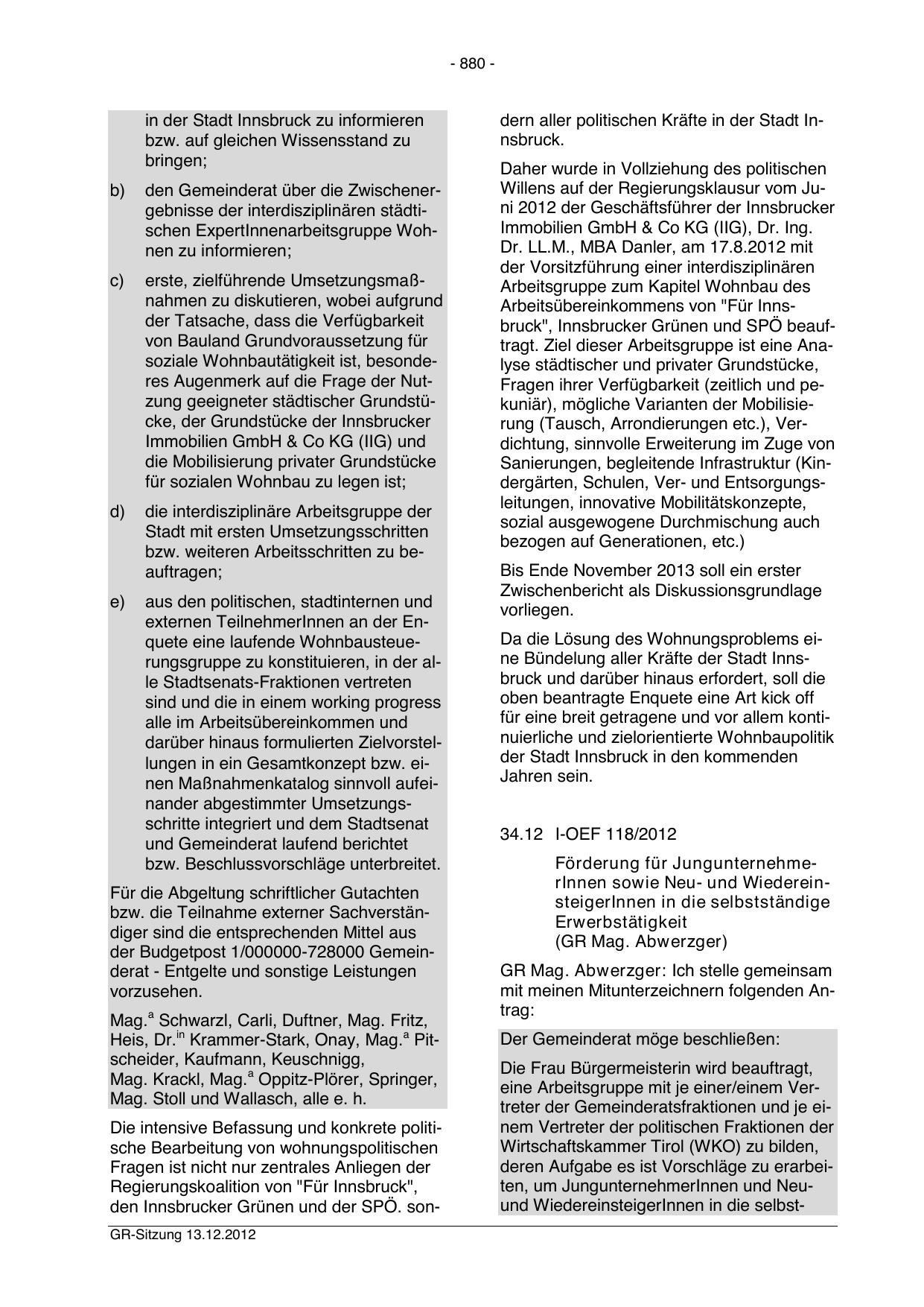 den Innsbrucker Grünen und der SPÖ. sonGR-Sitzung 13.12.2012