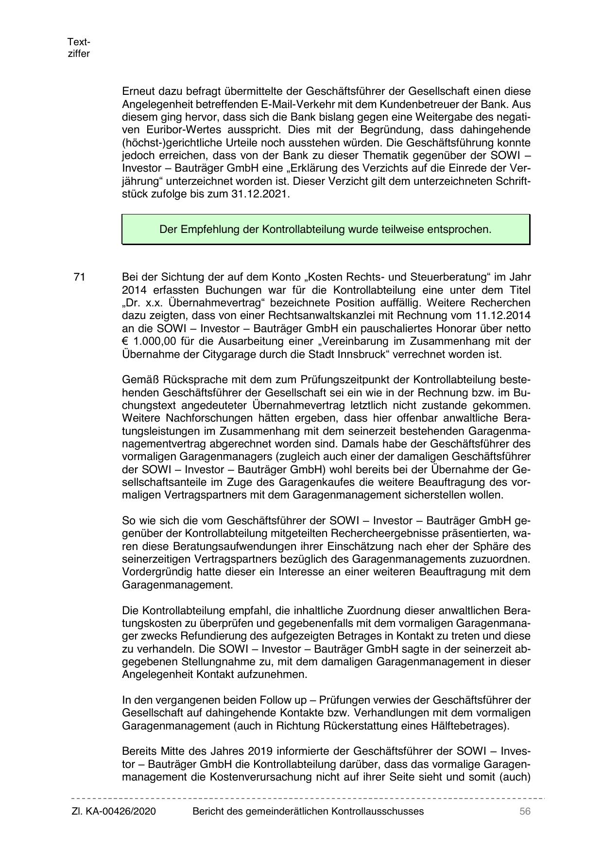 Die Kontrollabteilung empfahl, die inhaltliche Zuordnung dieser anwaltlichen Beratungskosten zu überprüfen und gegebenenfalls mit dem vormaligen Garagenmanager zwecks Refundierung des aufgezeigten Betrages in Kontakt zu treten und diese