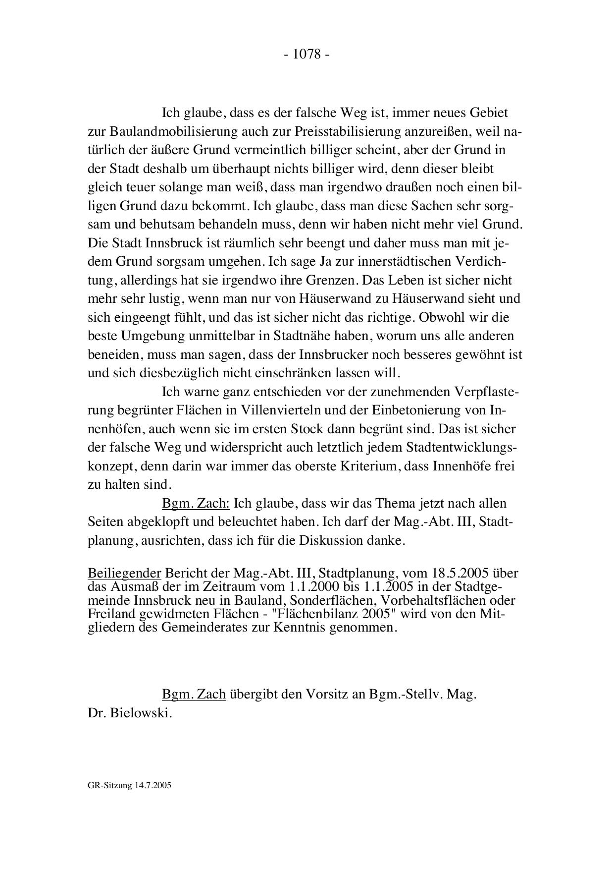 Freiland gewidmeten Flächen - "Flächenbilanz 2005" wird von den Mitgliedern des Gemeinderates zur Kenntnis genommen.