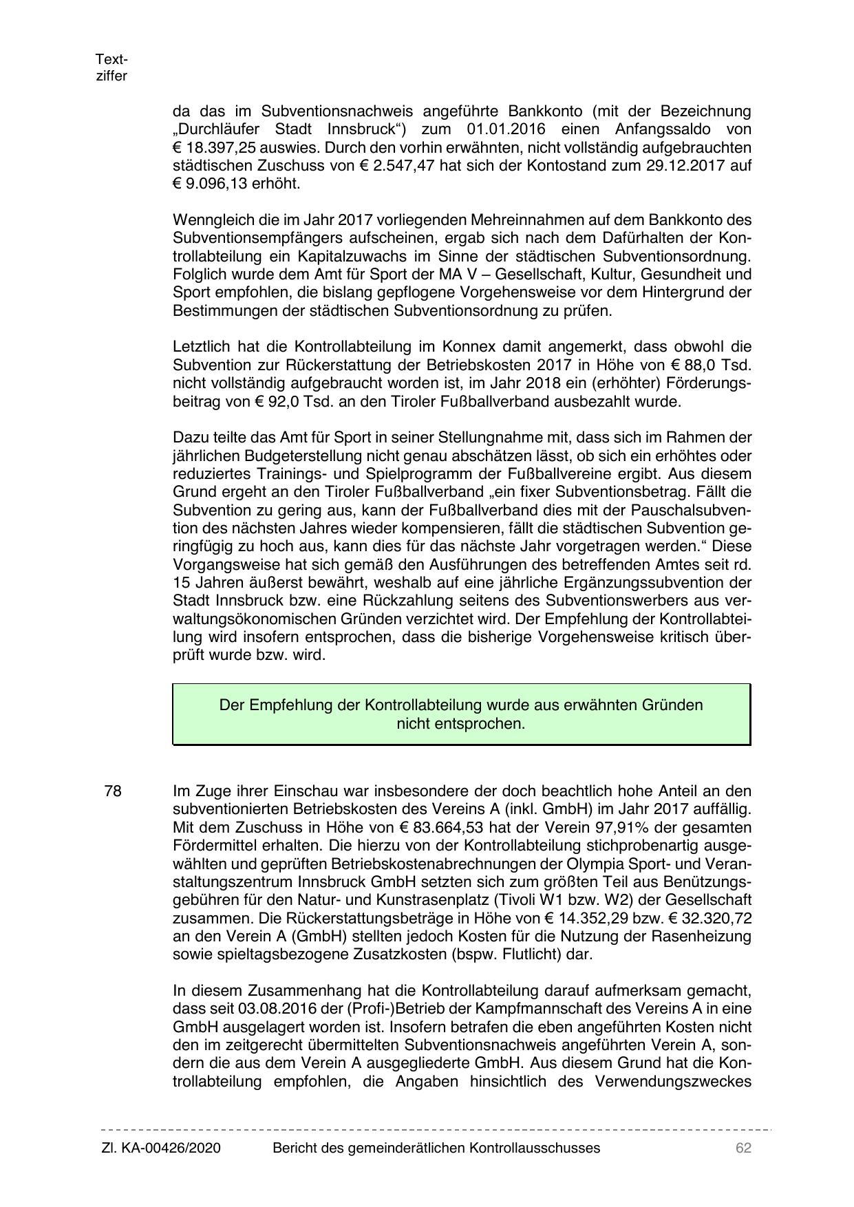 Stadt Innsbruck bzw. eine Rückzahlung seitens des Subventionswerbers aus verwaltungsökonomischen Gründen verzichtet wird. Der Empfehlung der Kontrollabteilung wird insofern entsprochen, dass die bisherige Vorgehensweise kritisch überprüft wurde bzw. wird.