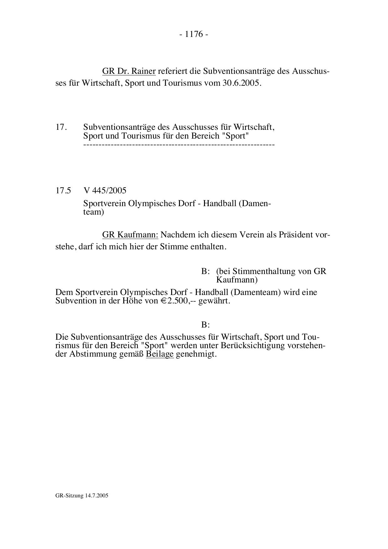 GR Dr. Rainer referiert die Subventionsanträge des Ausschusses für Wirtschaft, Sport und Tourismus vom 30.6.2005.