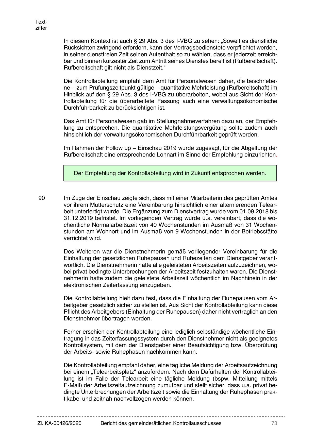 Die Kontrollabteilung empfahl dem Amt für Personalwesen daher, die beschriebene – zum Prüfungszeitpunkt gültige – quantitative Mehrleistung (Rufbereitschaft) im