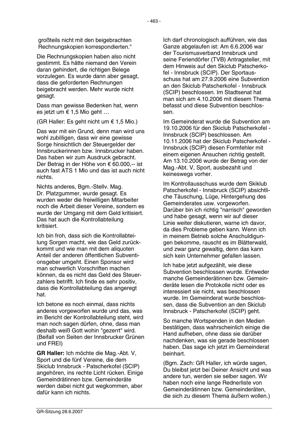 dem Hinweis auf den Skiclub Patscherkofel - Innsbruck (SCIP). Der Sportausschuss hat am 27.9.2006 eine Subvention