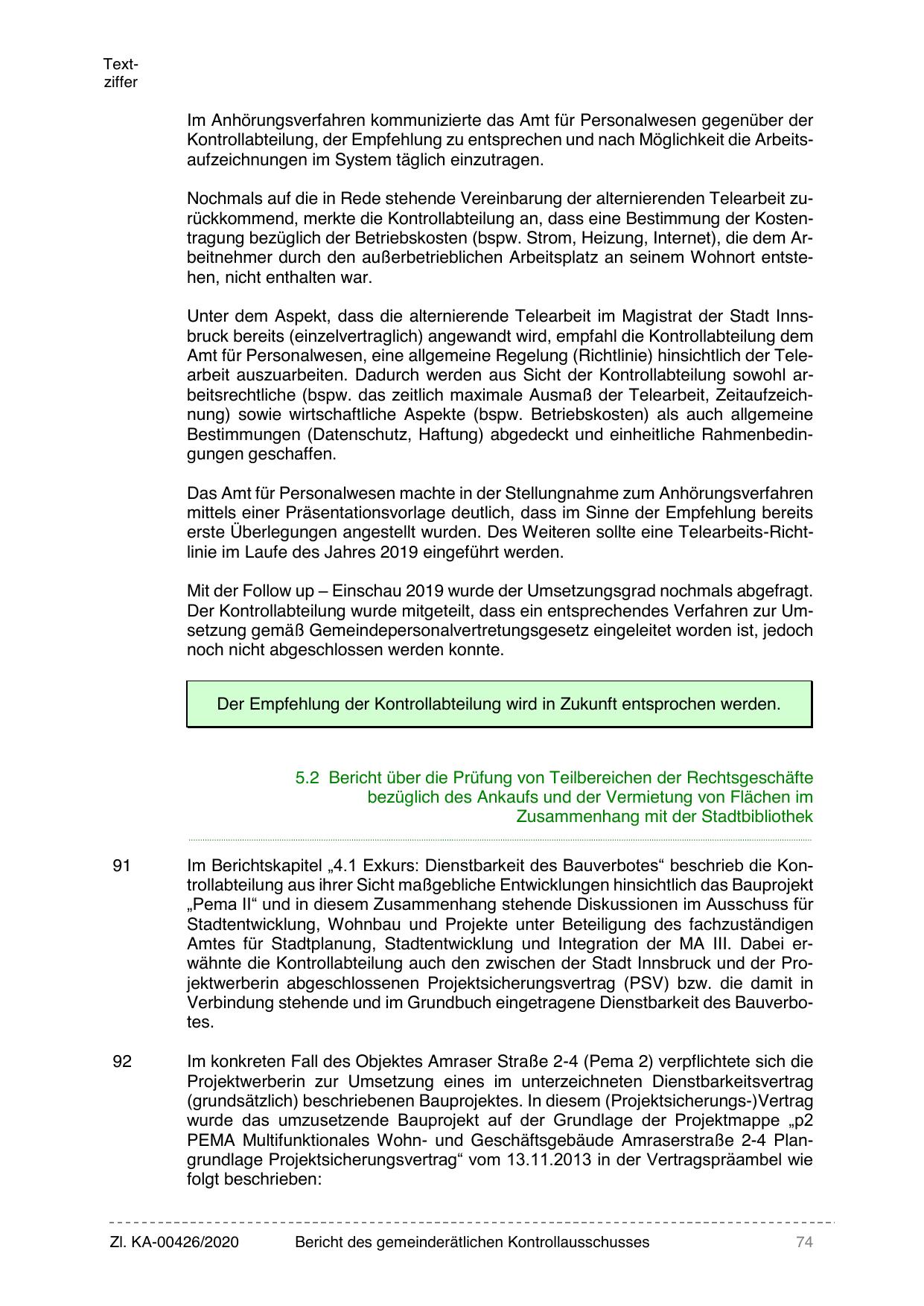 Unter dem Aspekt, dass die alternierende Telearbeit im Magistrat der Stadt Innsbruck bereits (einzelvertraglich) angewandt wird, empfahl die Kontrollabteilung dem