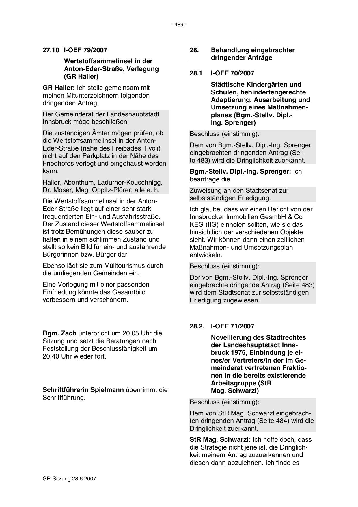 Dem von StR Mag. Schwarzl eingebrachten dringenden Antrag (Seite 484) wird die