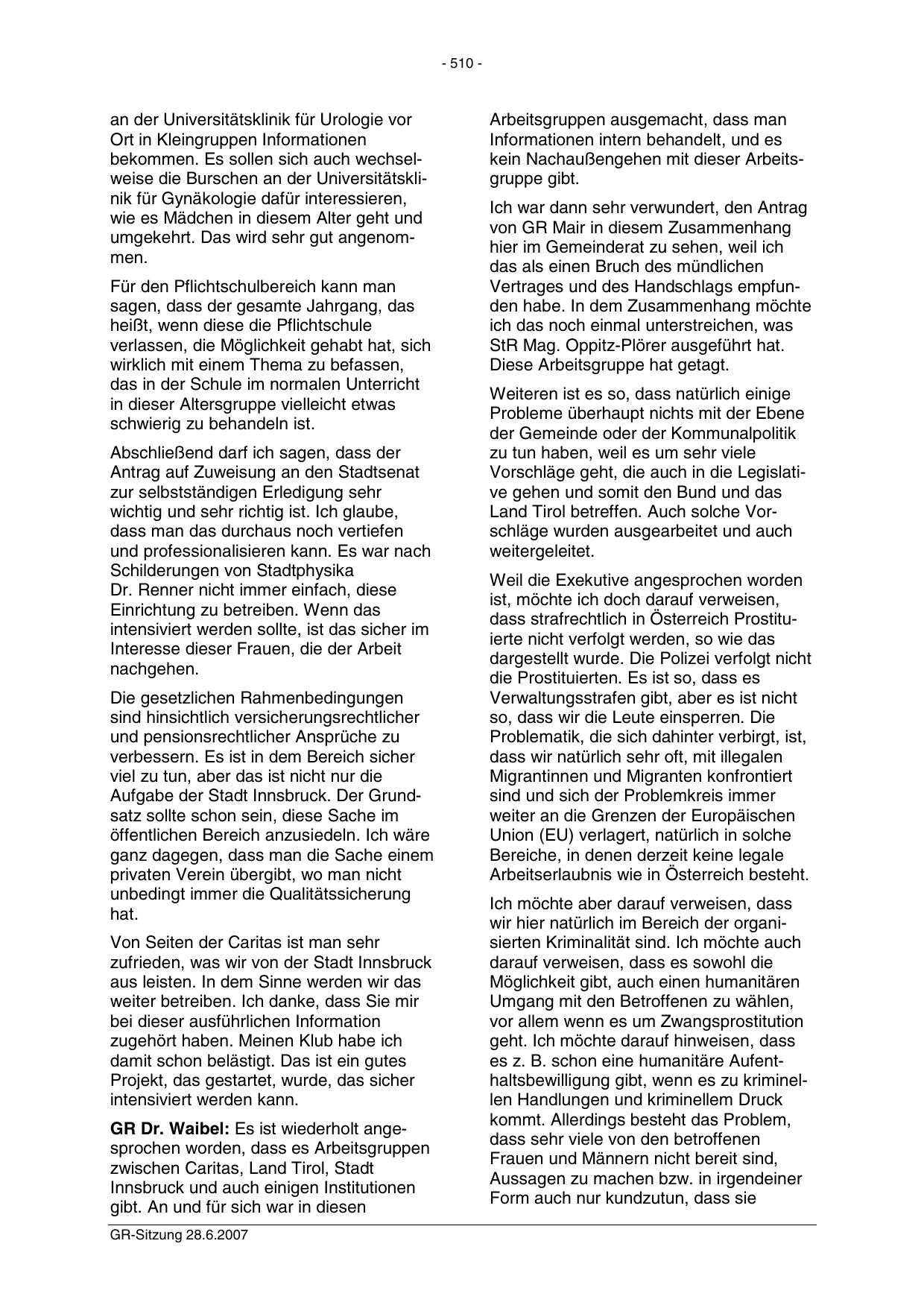 GR Dr. Waibel: Es ist wiederholt angesprochen worden, dass es Arbeitsgruppen