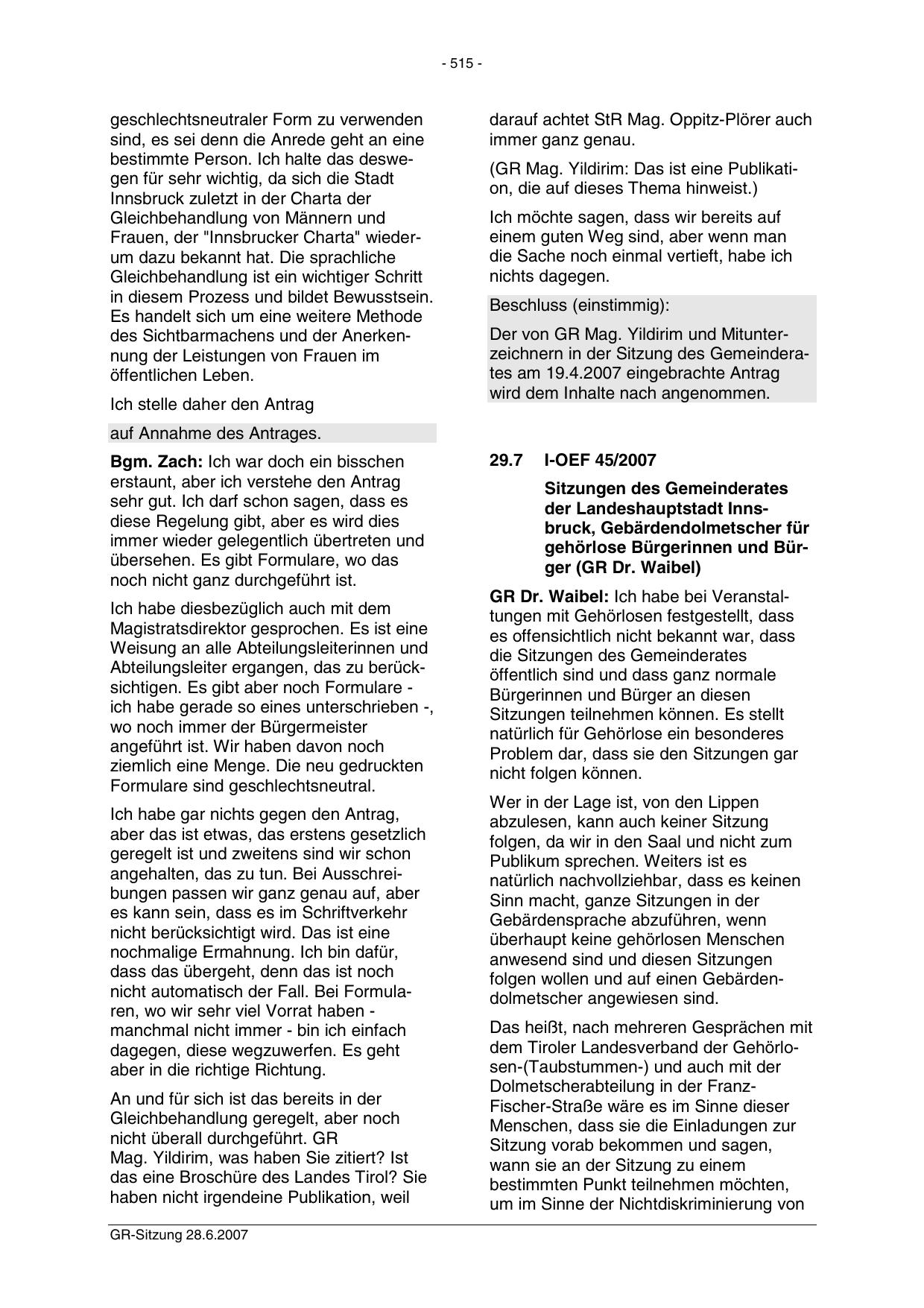 Der von GR Mag. Yildirim und Mitunterzeichnern in der Sitzung des Gemeinderates am 19.4.2007 eingebrachte Antrag