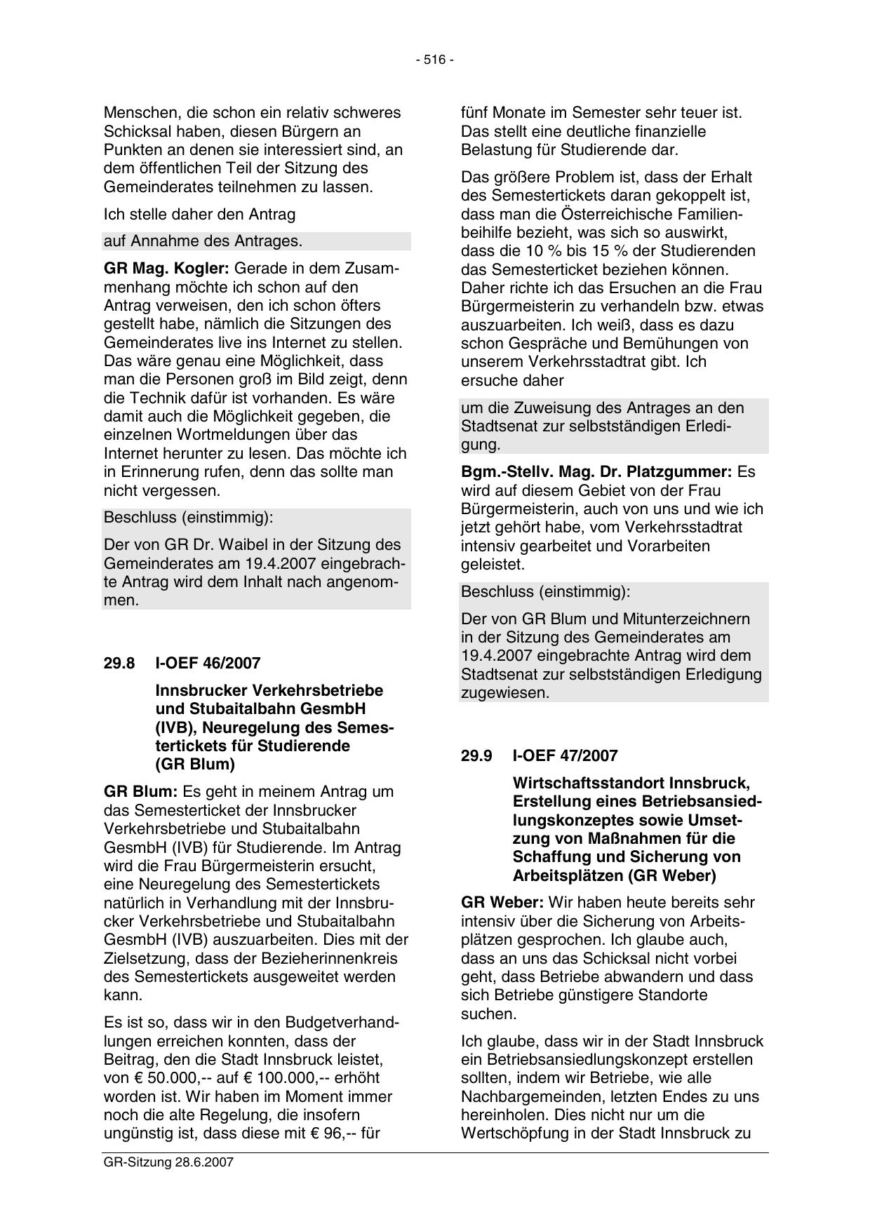 Gemeinderates am 19.4.2007 eingebrachte Antrag wird dem Inhalt nach angenommen.