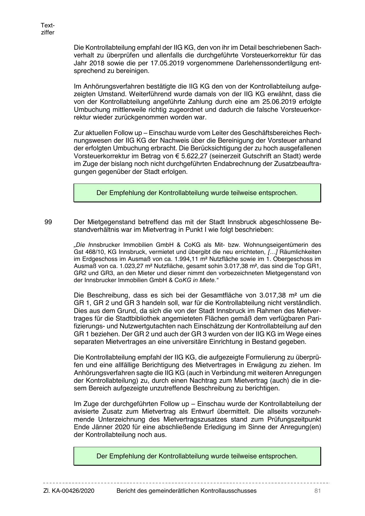 Die Kontrollabteilung empfahl der IIG KG, die aufgezeigte Formulierung zu überprüfen und eine allfällige Berichtigung des Mietvertrages in Erwägung zu ziehen. Im