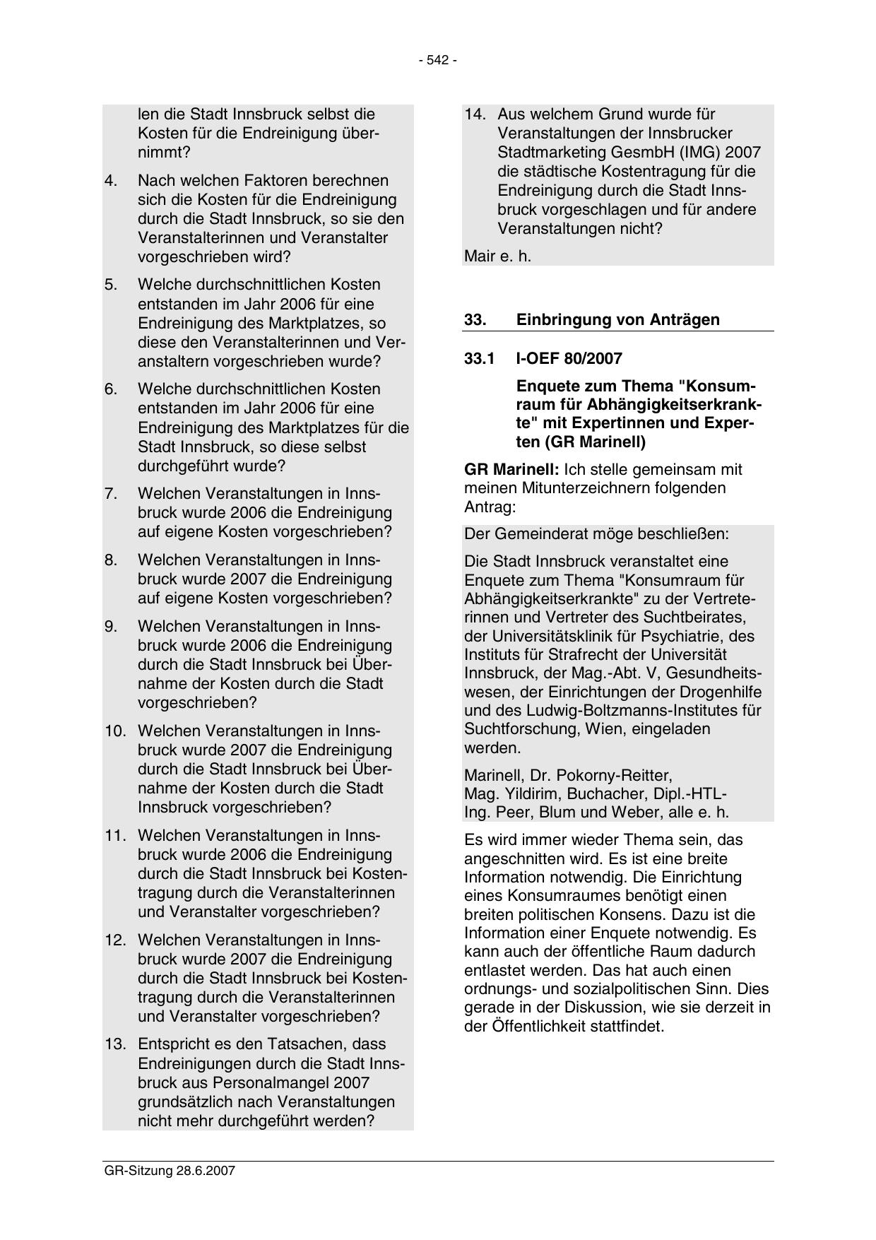 Enquete zum Thema "Konsumraum für Abhängigkeitserkrankte" mit Expertinnen und Experten (GR Marinell)